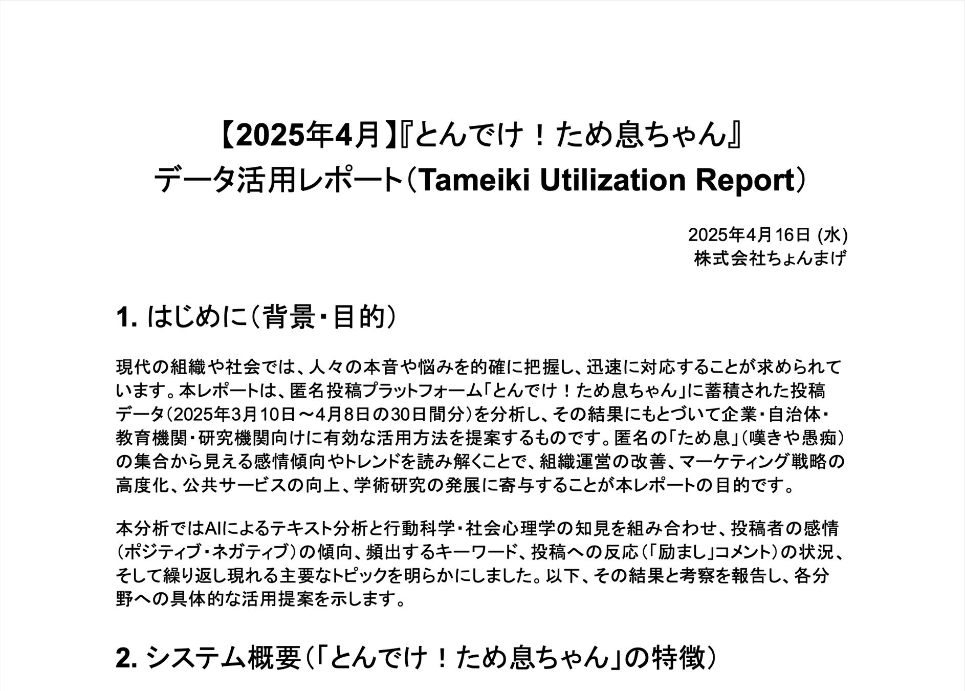 株式会社ちょんまげ(本社:神奈川県横浜市、代表取締役:石上和平)は、匿名投稿プラットフォーム『とんでけ!ため息ちゃん』に寄せられた約1万件の投稿データをAI技術を活用して分析し、『【2025年4月】『とんでけ!ため息ちゃん』データ活用レポート(Tameiki Utilization Report)』として公開しました。