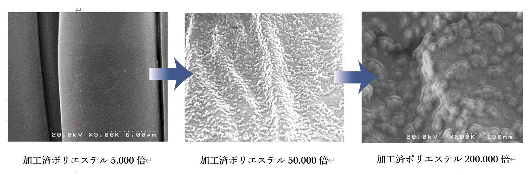 ポリエステルにおいても、50.000倍でナノ粒子が隙間なくコートされている事が確認できる。