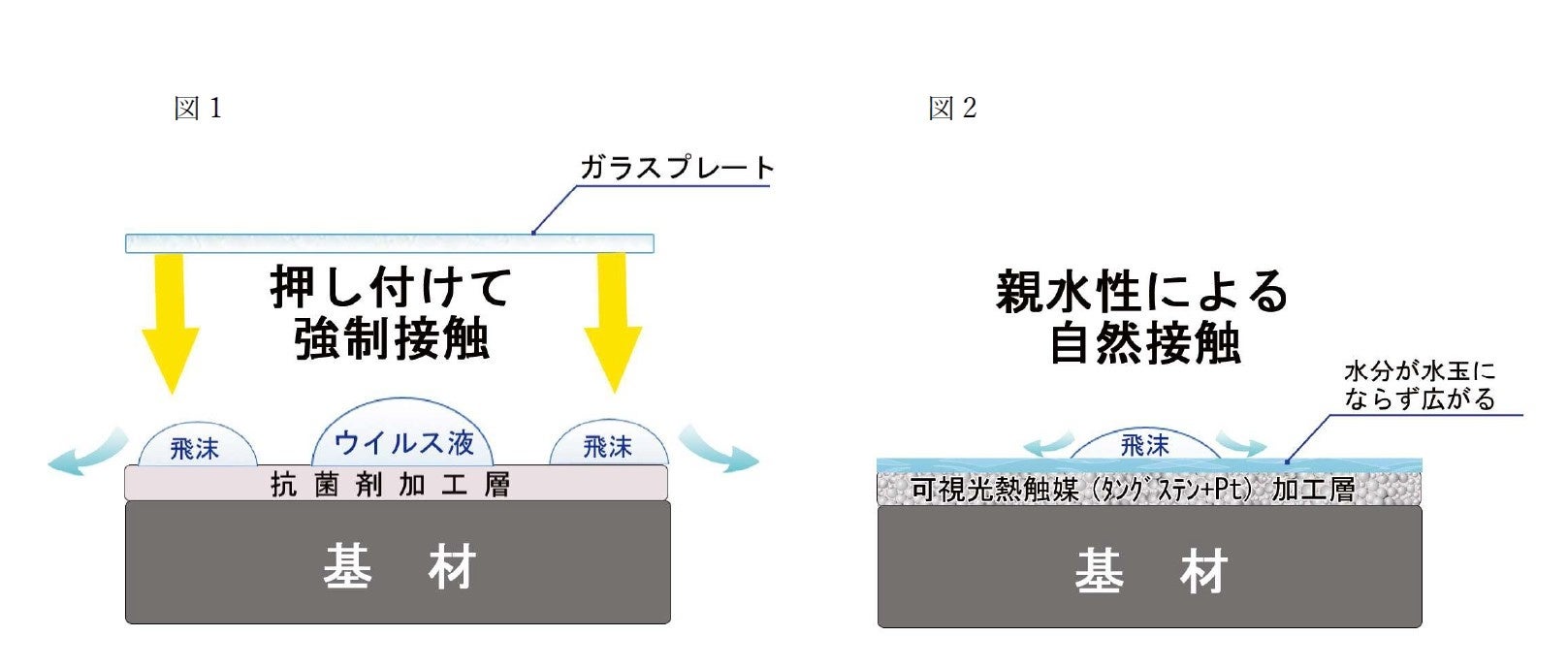 通常の抗ウイルス試験は、その上からガラス等でカバーし確実にコーティング面と接触させて試験しています。この場合、コーティング面が疎水性でウイルス液を弾いている場合であっても上から押さえつけることで強制接触されますが、実環境では水滴が乾いてからしかウイルスとコーティング面が接触されない為、抗ウイルス効果にかかる時間に齟齬が生じていると考えられます。
