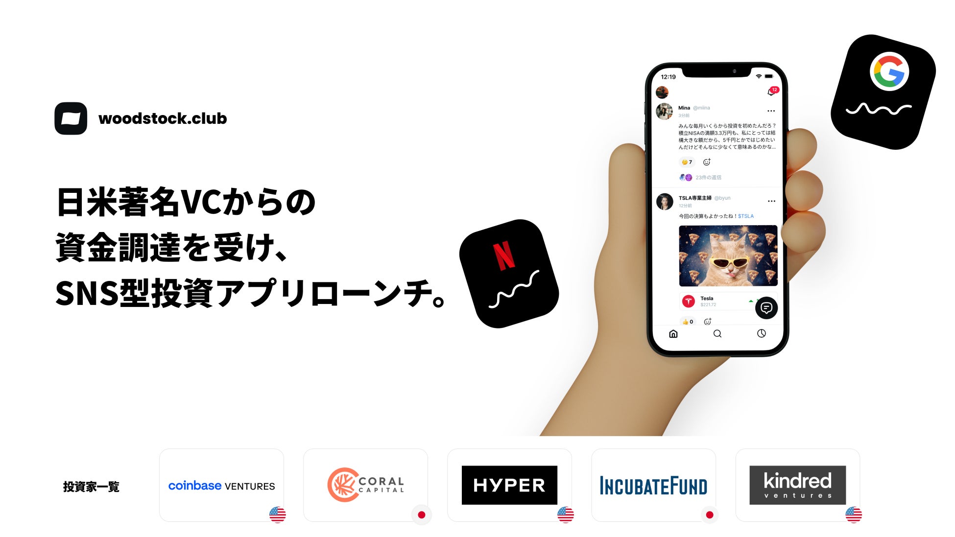 「Woodstock(ウッドストック)」(東京都港区、代表取締役 ブライアン ジェフン ユン https://www.woodstock.co )は、日米の著名ベンチャーキャピタル5社(国内2社、米国3社)からの資金調達を実施し、次世代向けSNS型投資アプリwoodstock.club をローンチしました。また、米国株投資を1000円から可能にするとともに、ユーザー同士でのポートフォリオシェアや交流を通じて、初心者でもモバイル一つで安心して投資を始めていただける全く新しい投資体験を提供して参ります。【投資家一覧】 *アルファベット順Coinbase Ventures (米国)/ Coral Capital / HYPER(米国) / Incubate Fund / Kindred Ventures(米国)