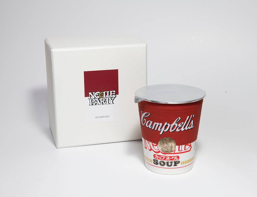 「NOODLE PARTY」はキャンベル・スープ缶の塗装がなされたカップヌードルを、アーティストによる創作マナーに従って食べる、というアートプロジェクトです。同名の作品《NOODLE PARTY》(キャンベル・スープの塗装がなされたカップヌードル本体)の購入者はアーティストによるマナー講座に参加し、アーティストとともにカップヌードルを食べることができます。