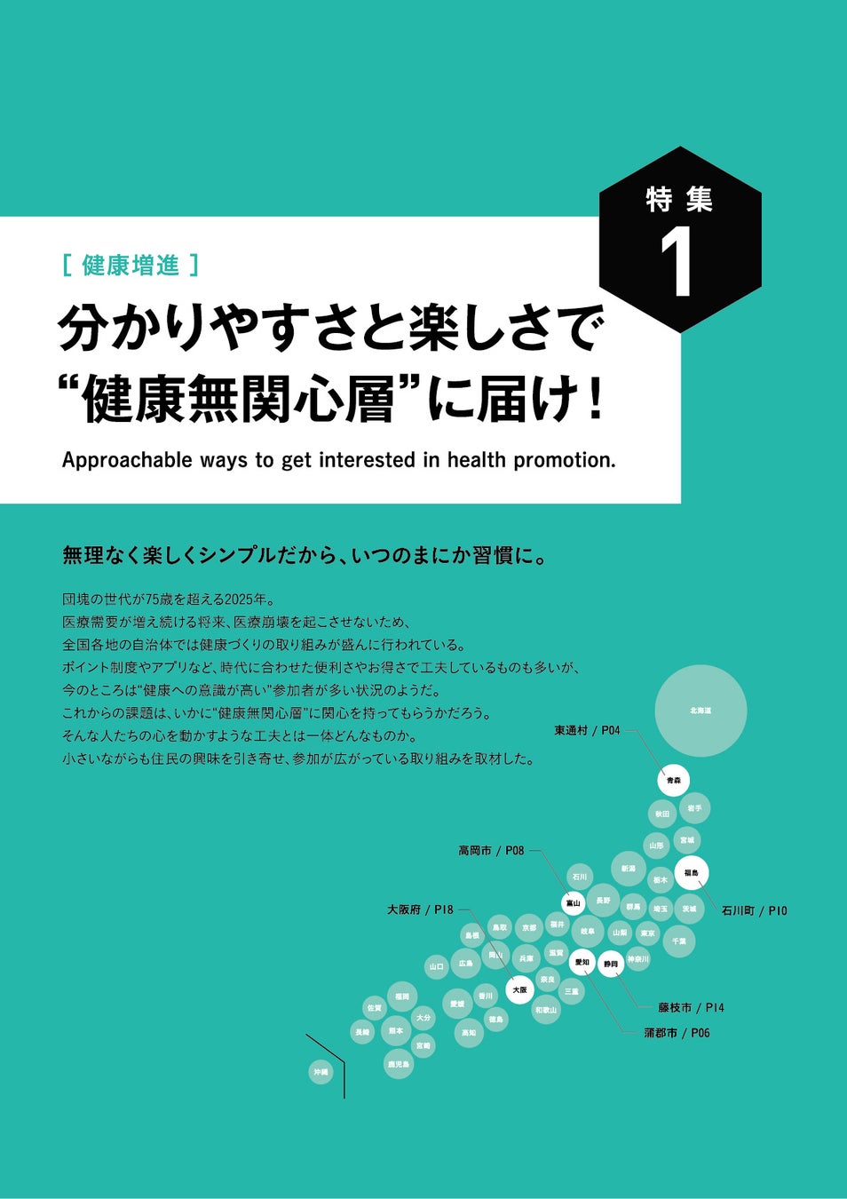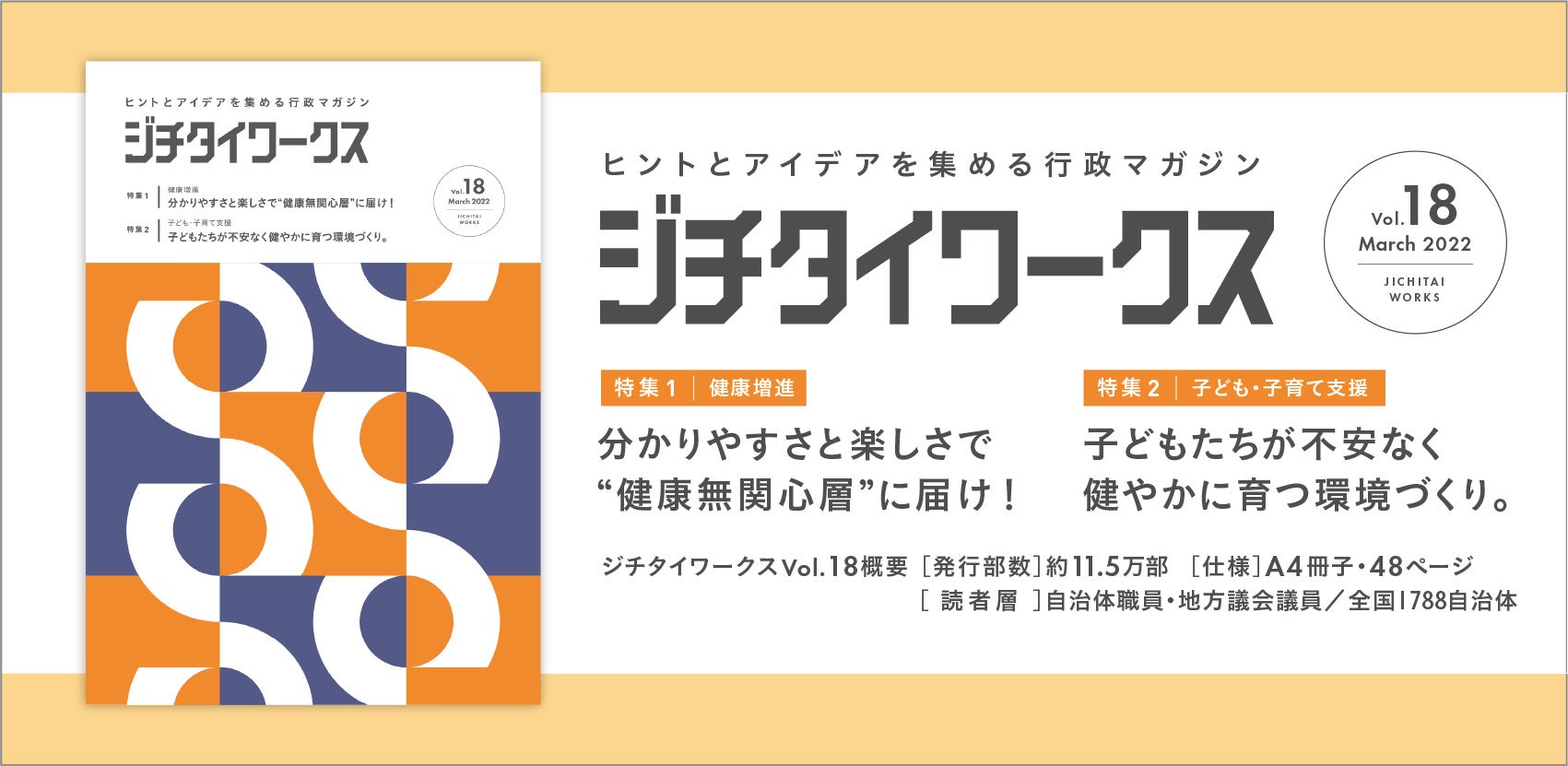 『ジチタイワークス』は、2017年12月22日の創刊以来、自治体職員にヒントとアイデアを提供する情報誌としてご愛顧いただいております。今号の特集1では、[健康増進:分かりやすさと楽しさで“健康無関心層”に届け!]をテーマに、青森県東通村、愛知県蒲郡市、富山県高岡市の健康増進への取り組み事例をご紹介しております。特集2では、[子ども・子育て支援:子どもたちが不安なく健やかに育つ環境づくり。]をテーマに、兵庫県明石市長のスペシャルインタビュー、新潟市の子ども・子育て支援事例を取り上げています。