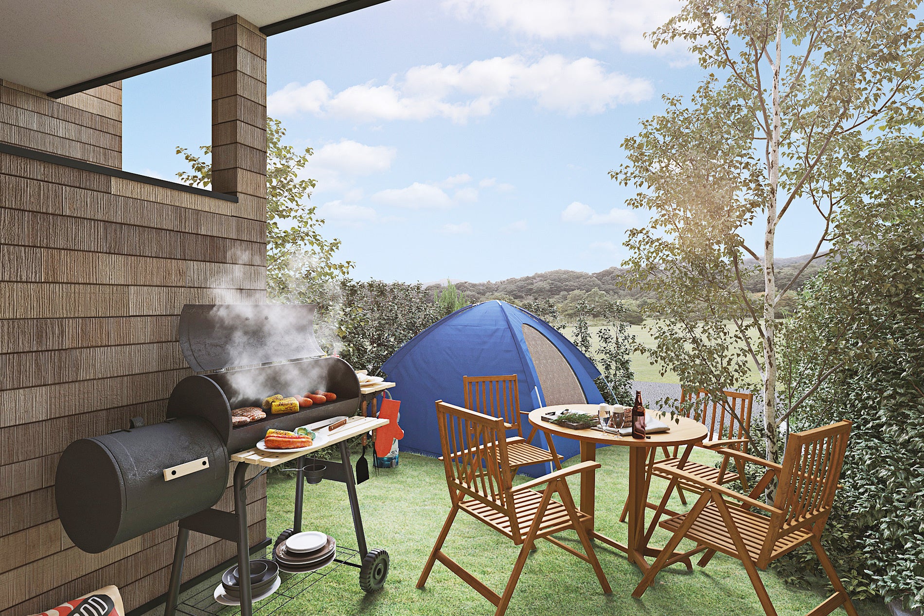 メゾネットタイプで、1部屋ずつ独立した入り口があり、各部屋には庭がついているので、グランピングやBBQを楽しみつつ、フルオーダーメイド家具でデザインされた、キッチンや寝室もご利用いただけます。