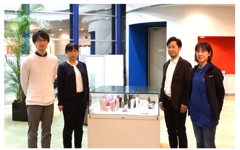 左から順に、門廻充侍(東北大学災害科学国際研究所 助教)、奥山純子 (東北大学病院 助教)、本川智紀(me-fullnessファウンダー)、加藤朋美 (me-fullnessコファウンダー)。ポーラ化成工業 横浜研究所にて。
