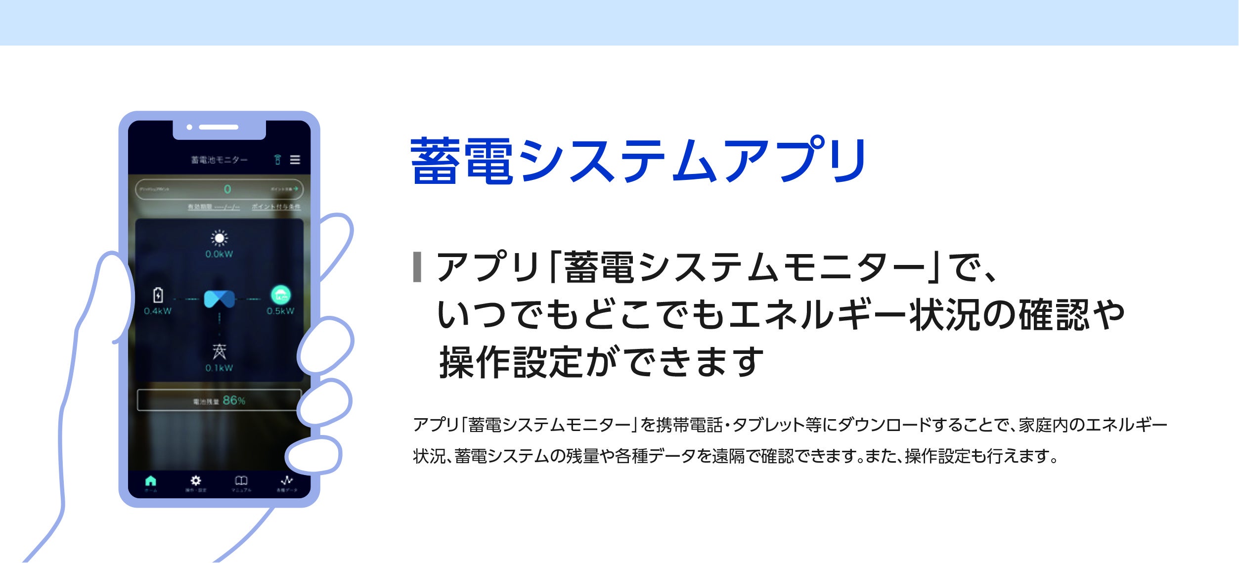〇蓄電システムアプリでいつでもエネルギー状況の確認・設定ができます。