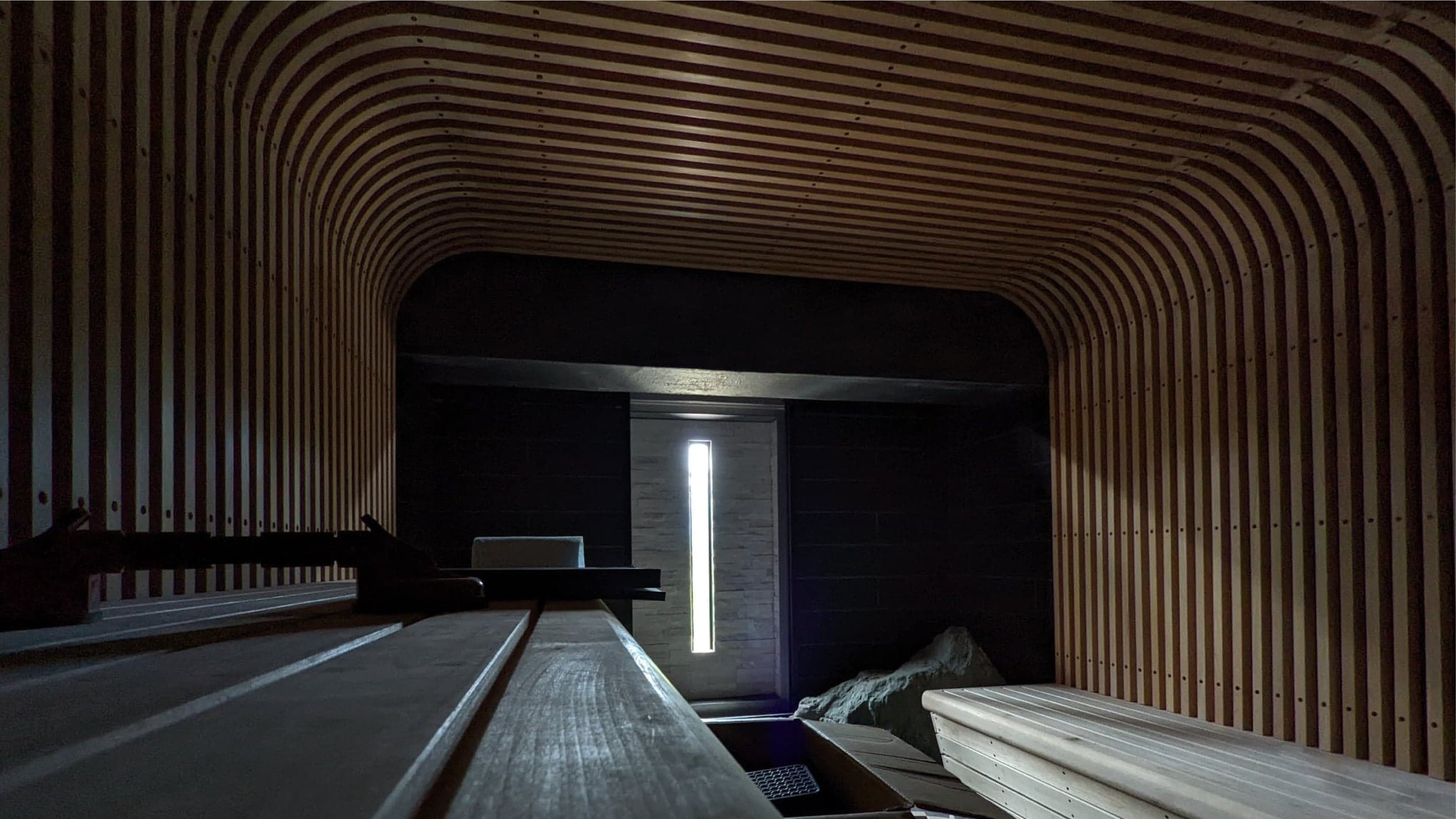 HARVIA社製の対流湿式サウナストーブLEGEND300を設置し、天井は蒸気がまわりこみやすいアール設計仕様。蒸気の対流をダイレクトに感じる天井高1.1mの座面に腰を掛け、地元のオーガニックアロマを使ったロウリュを体感できます。さらに利根川源流の湧水(水温は通年10〜16°C)掛け流しの水風呂と、谷川岳を眺めながらの外気浴で、みなかみの自然に身体を預け、唯一無二の開放的なサウナ体験を楽しむことができます。