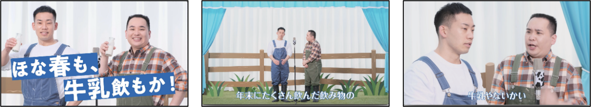 中央酪農会議においては、酪農関係団体やJAグループの協力の下、年末年始から引き続き、牛乳となじみの深いお笑い芸人「ミルクボーイ」を活用した広告活動を通じて、皆様に危機的な状況や生乳の活用法を知っていただき、再び消費のご協力を促す狙いです。