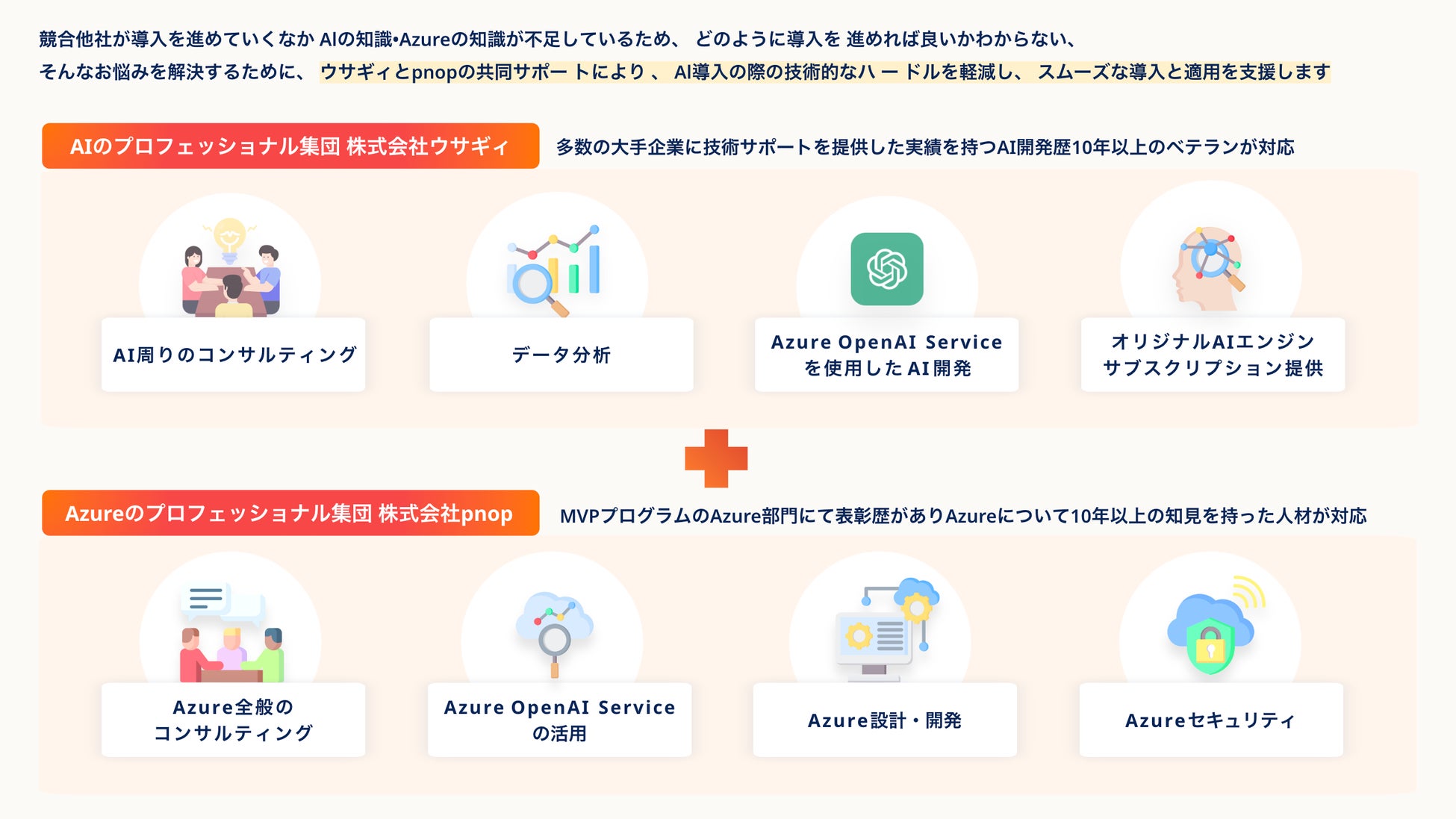 生成AIの専門家ウサギィ社とMicrosoft Azureの専門家pnop社が協業し、GPTをはじめとする生成AIの活用をトータルサポートする「usagee&pnop AI導入サービス」を提供開始
