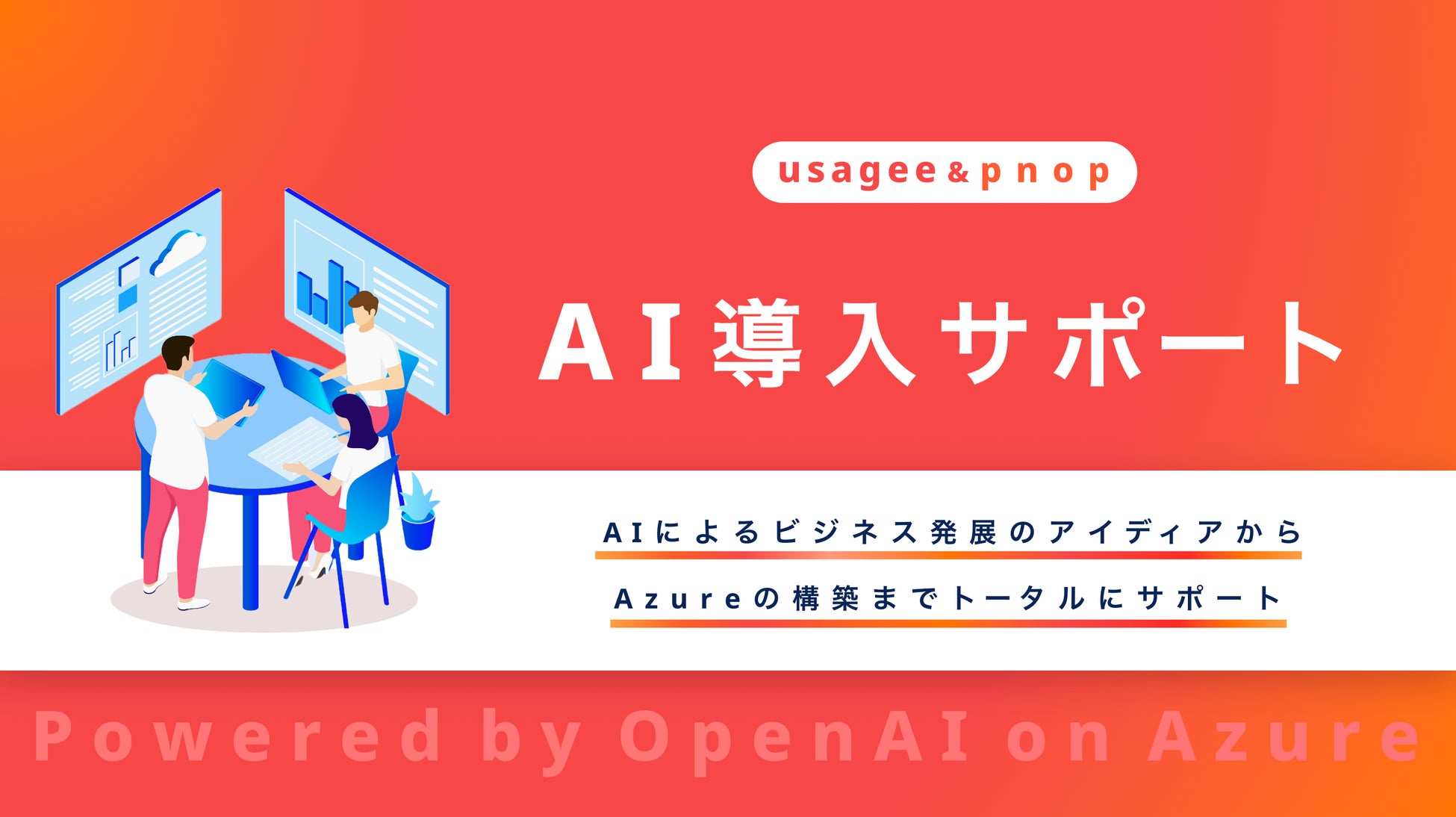 AI分野のエキスパートである株式会社ウサギィ(代表取締役 町裕太、以下ウサギィ社)と、Microsoft Azureのエキスパートである株式会社pnop(代表取締役、浅見城輝、以下pnop社)は協業体制を強化し、企業のビジネス発展のアイディアからAzureの構築まで、GPTをはじめとする生成AI導入の全工程をトータルサポートする新サービス『usagee&pnop AI導入サービス』を提供することをお知らせします。