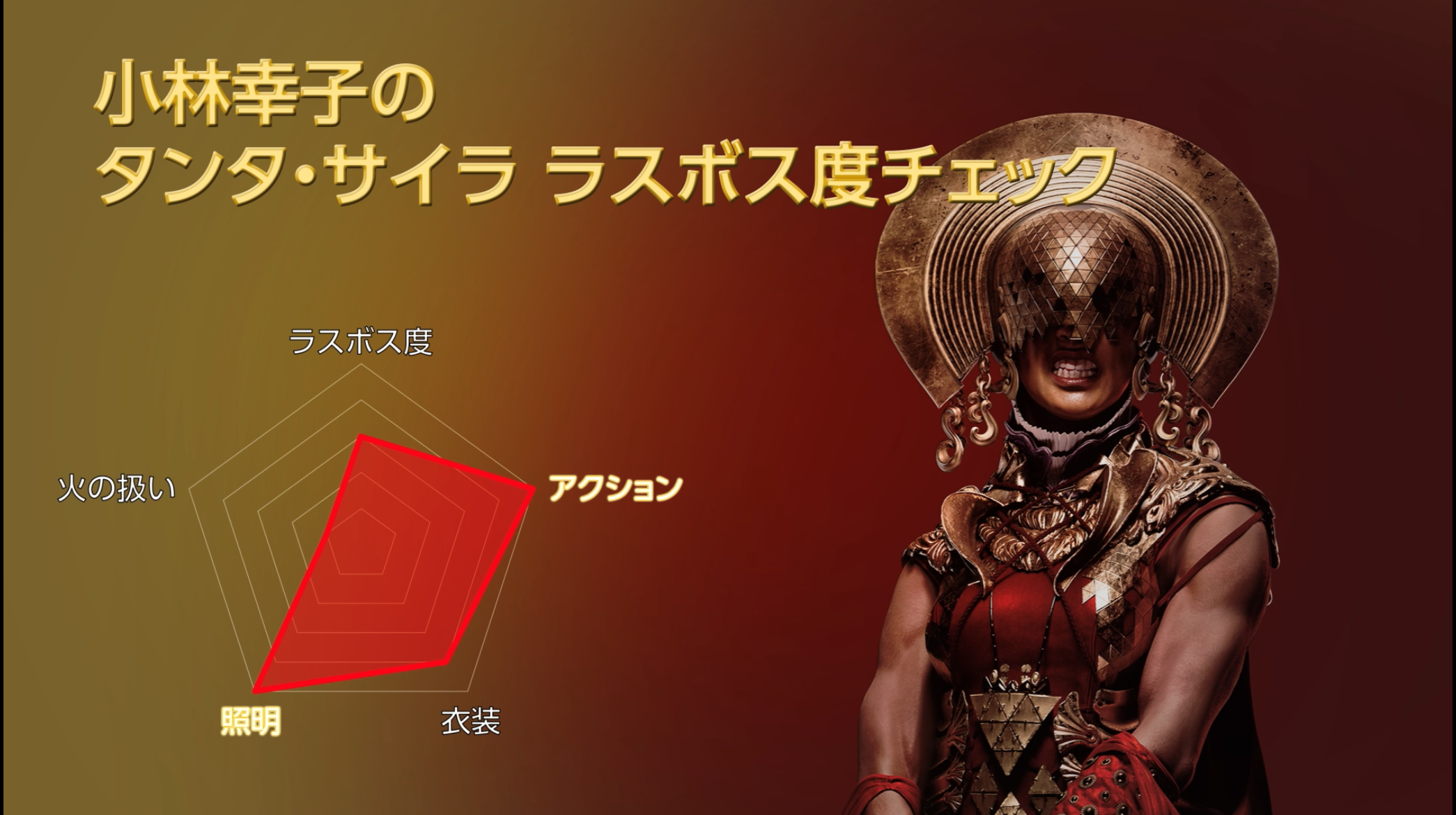 WEBCMの放映に先駆けて、世間から「ラスボス」と呼ばれる小林幸子さんに『FORSPOKEN』のラスボス的存在である「タンタ」の紹介映像をご覧頂きながら、実況をしていただく「小林幸子による”タンタ”ラスボス度チェック」ムービーも公開となりました。それぞれの「タンタ」や主人公「フレイ」などのキャラクターに合わせて小林幸子さん独自の項目で評価する「“タンタ”ラスボス度チェック」を作成し、発表していただきました。