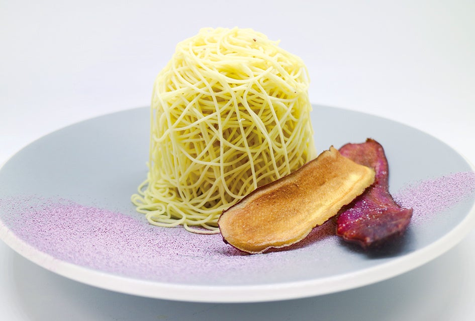 糸のように細くたっぷりと絞ったお芋のペースト、その下のさくさくのメレンゲと、ほろ苦くキャラメリゼしたバナナが絶妙にマッチした大人気のモンブラン。注文が入るごとにペーストを搾るのでお芋の風味が抜群です!
