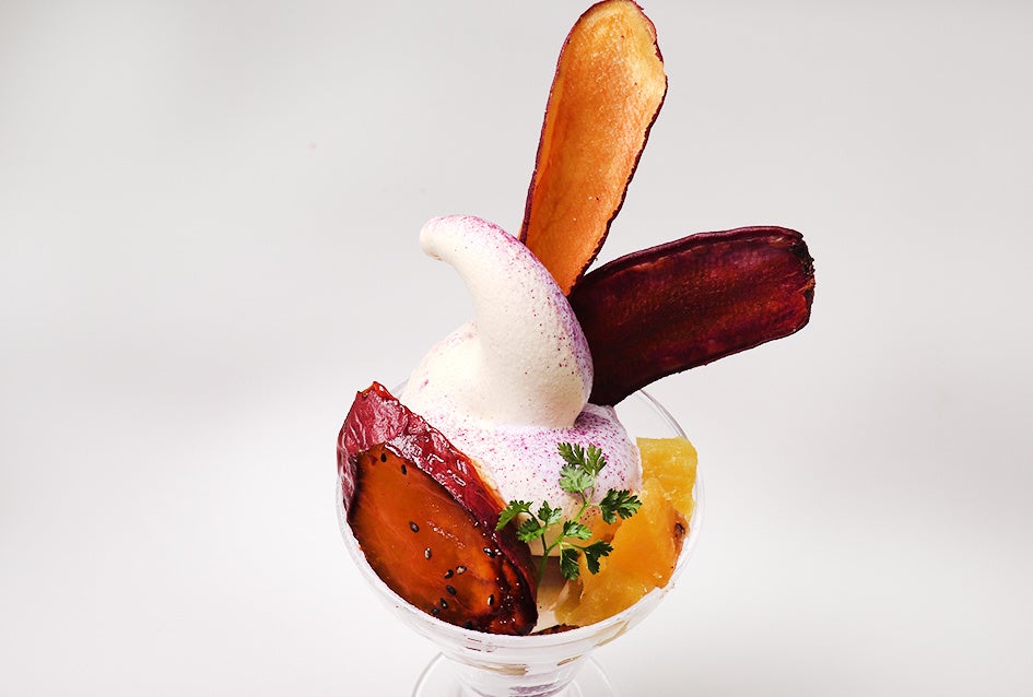 きいろと紫、2種類の自家製お芋ソフトクリームに、カリッと香ばしい大学芋、ほんのり塩気がたまらないお芋チップスとトッピング。見た目も味も楽しいパフェです。