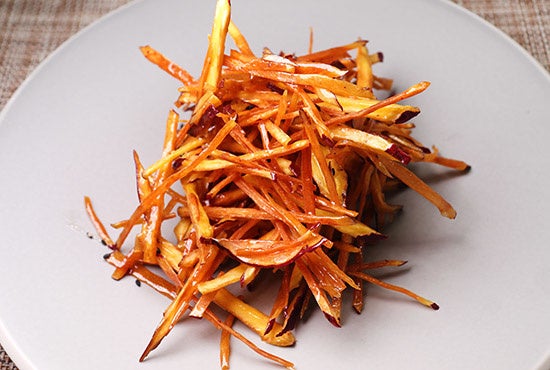 極細に手切りしたさつま芋をカリッと揚げて自家製の糖蜜と絡ませた逸品。