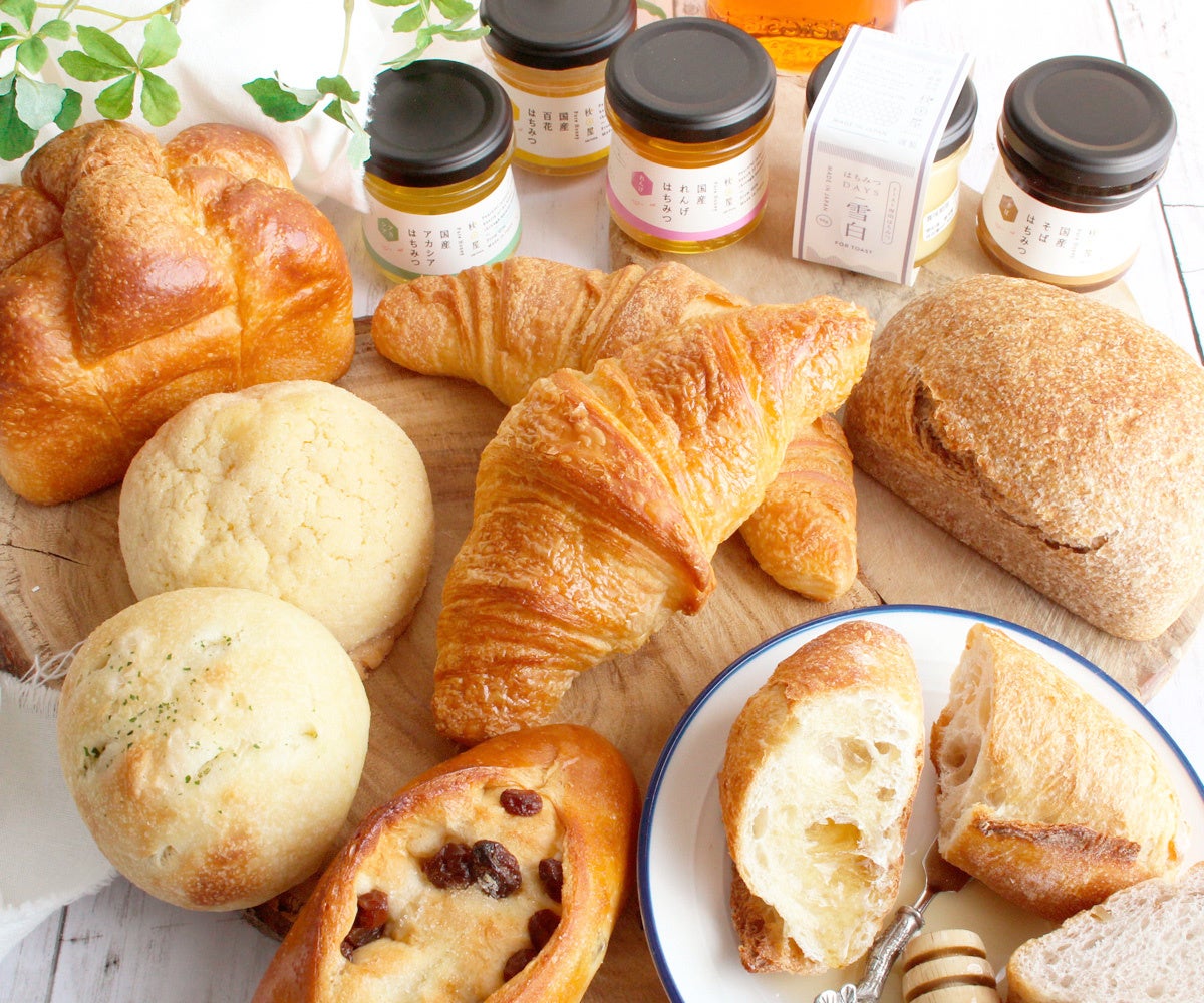 ●お届け内容:食パン1個、食事パン1個、バラエティパン2~3個、トースト専用はちみつ雪白1個、国産はちみつ1個