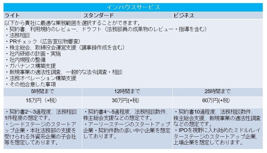 ビジネスが前に進みだし、日常的に締結する契約が一定数以上に増えてきたスタートアップ企業などから法務機能を丸ごとアウトソースいただくというような形や、大企業のうちのスタートアップ企業との連携を担当する部門・CVC等で、自社法務部に十分な知見がなかったり支援が受けにくいような場合にその部署の契約業務をアウトソースいただくような形でインハウスサービスを利用いただくことが想定されます。また、大企業の法務部でも、十分な経験がある人員が不足しているというような場合に、人手不足の解消を目的として経験豊富な弁護士のサポートを受けるというような利用の形もありえます。