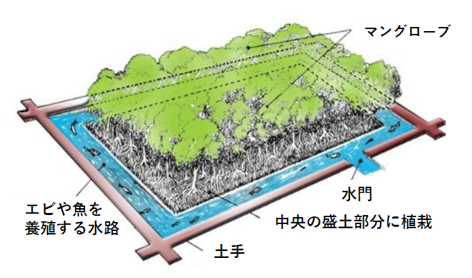 シルボフィッシャリーとは、 造林 ( Silviculture)と水産業 ( Fishery)を組み合わせた方法で 、 エビ養殖池にマングローブを植林し、自然に近い状態でエビや魚を育てる手法で、以下の特徴があります 。