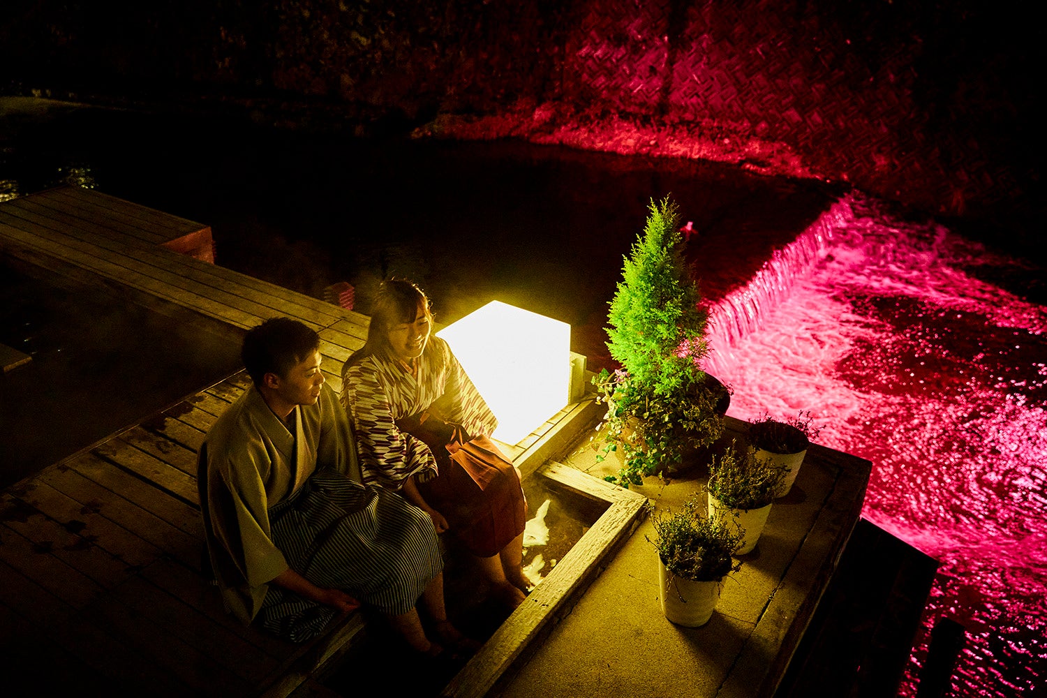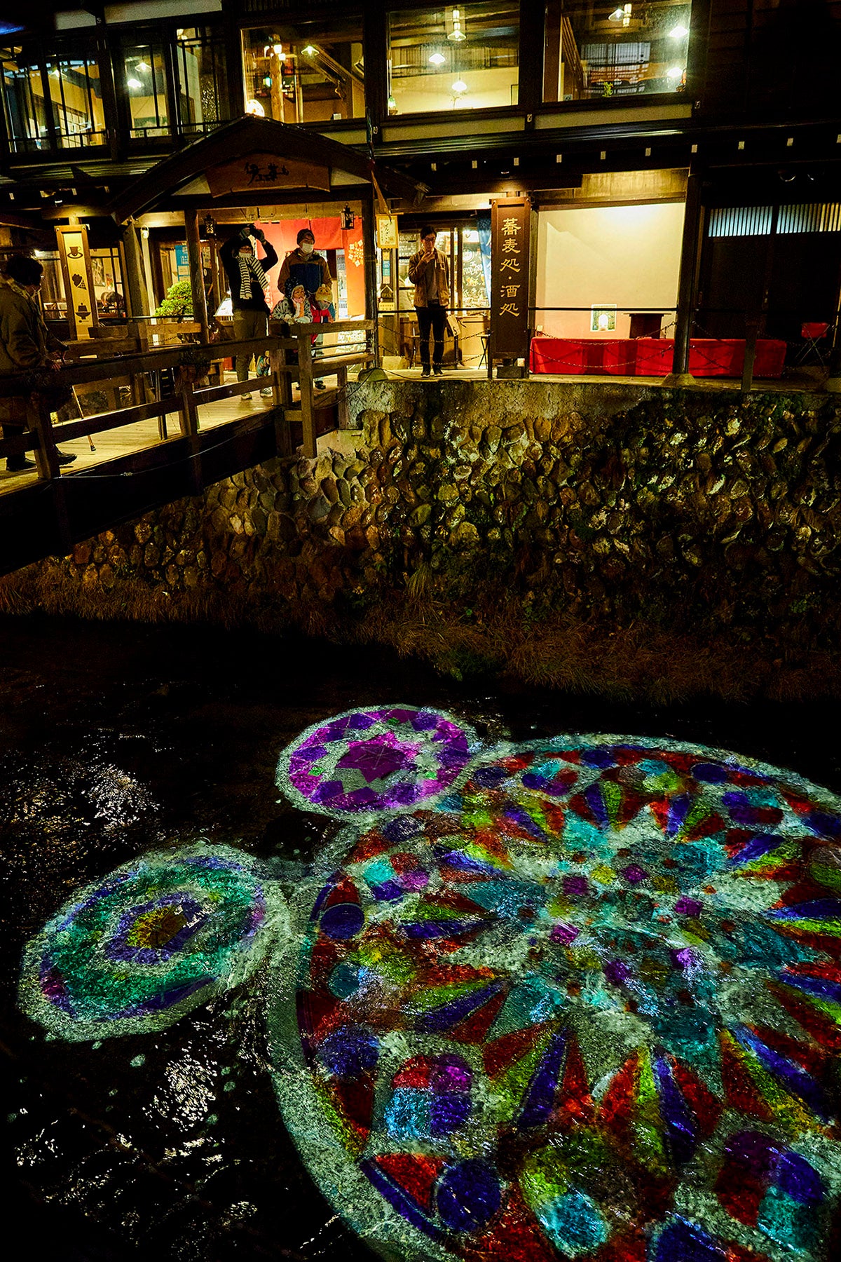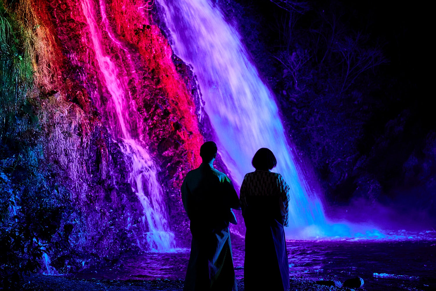 漆黒の闇に包まれた山間に忽然と現れる光の空間は、周囲の自然と相まって昼間の景色とはまた異なる美しさ!もちろん、絵になるスポットも盛りだくさんです!秋の夜長に相応しいアーティスティックなひとときを食べ歩きや足湯を楽しみながら、のんびりとご堪能ください。中でもライトアップされた「白銀の滝」は、ごうごうと流れ落ちる水しぶきと光の共演がワイルドな迫力満点の景色です!