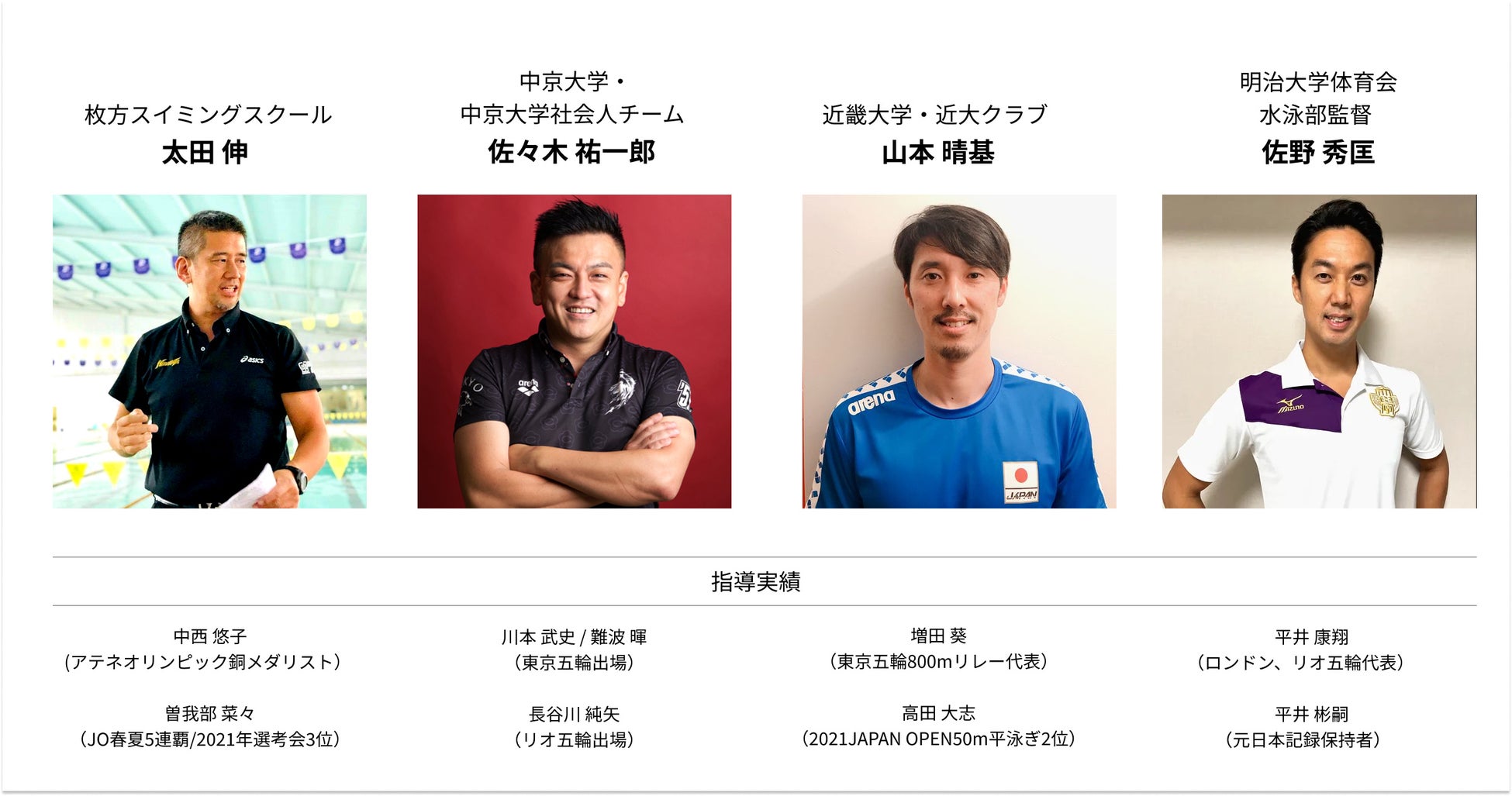 競泳での実績や専門的知識はもちろん、事業開発・サービス開発においても経験豊富なメンバーで運営をしてまいります。