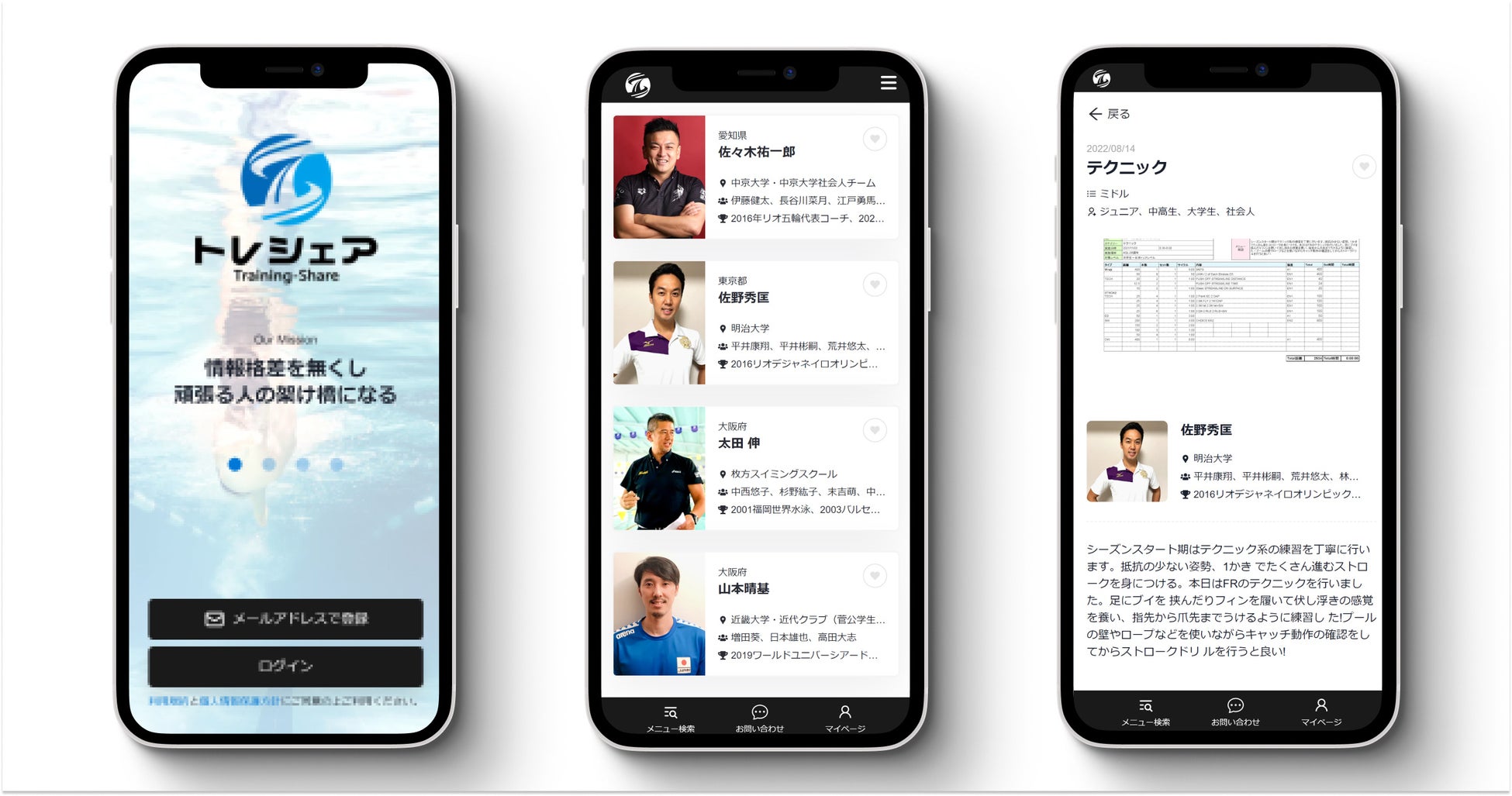 トレシェアとは、水泳で速くなるために重要な練習メニューを調べることができるサービスです。