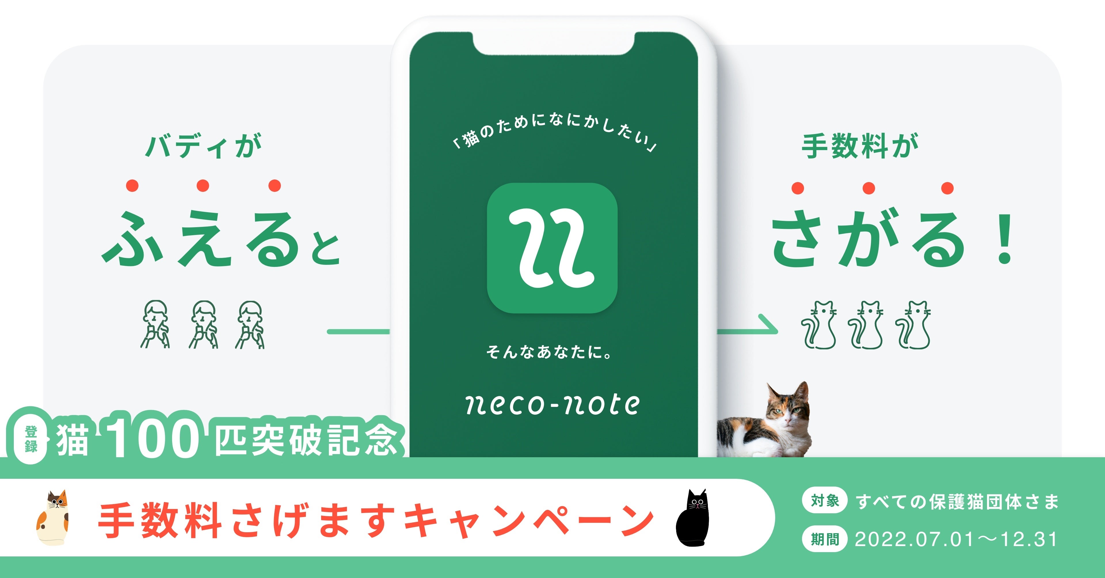 投げ銭・月額課金で保護猫を支援できる”猫の推し活”Webサービスneco-note(ネコノート)が、登録猫100匹突破を記念し、2022年7月1日より『手数料さげますキャンペーン』を開催!