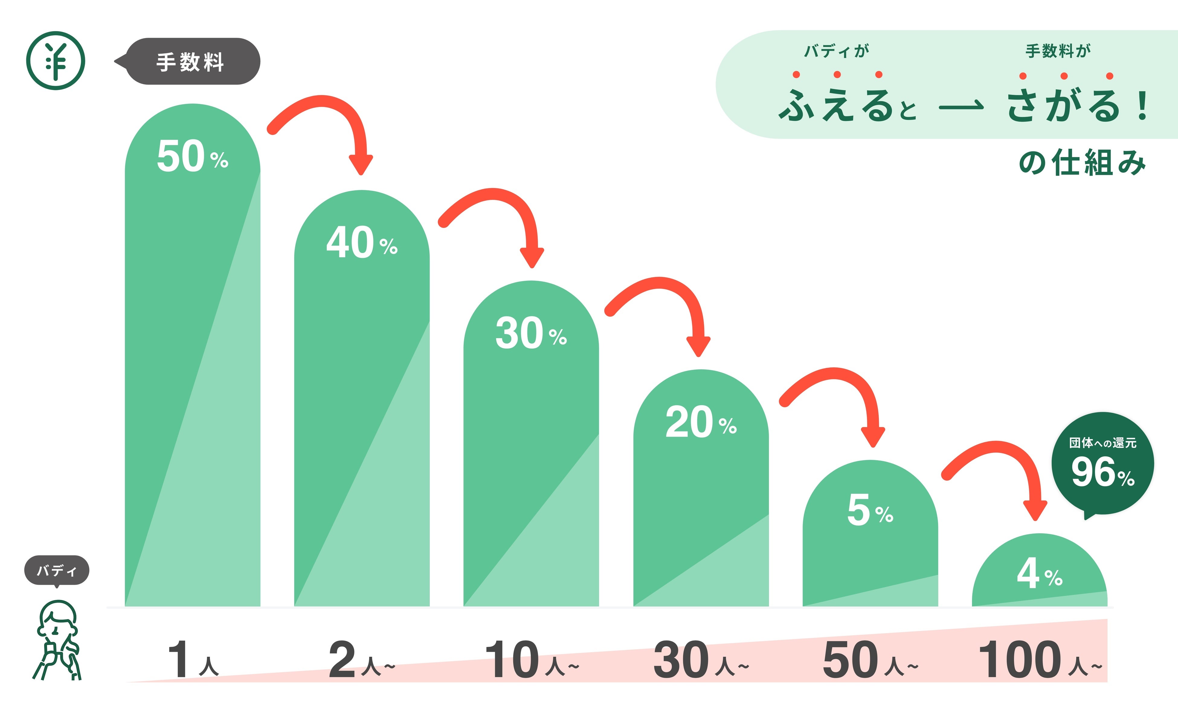 ・内容:保護猫団体ごと集まったバディの数に応じて、手数料を減額し、最大で手数料を4%に減額することが可能になります。