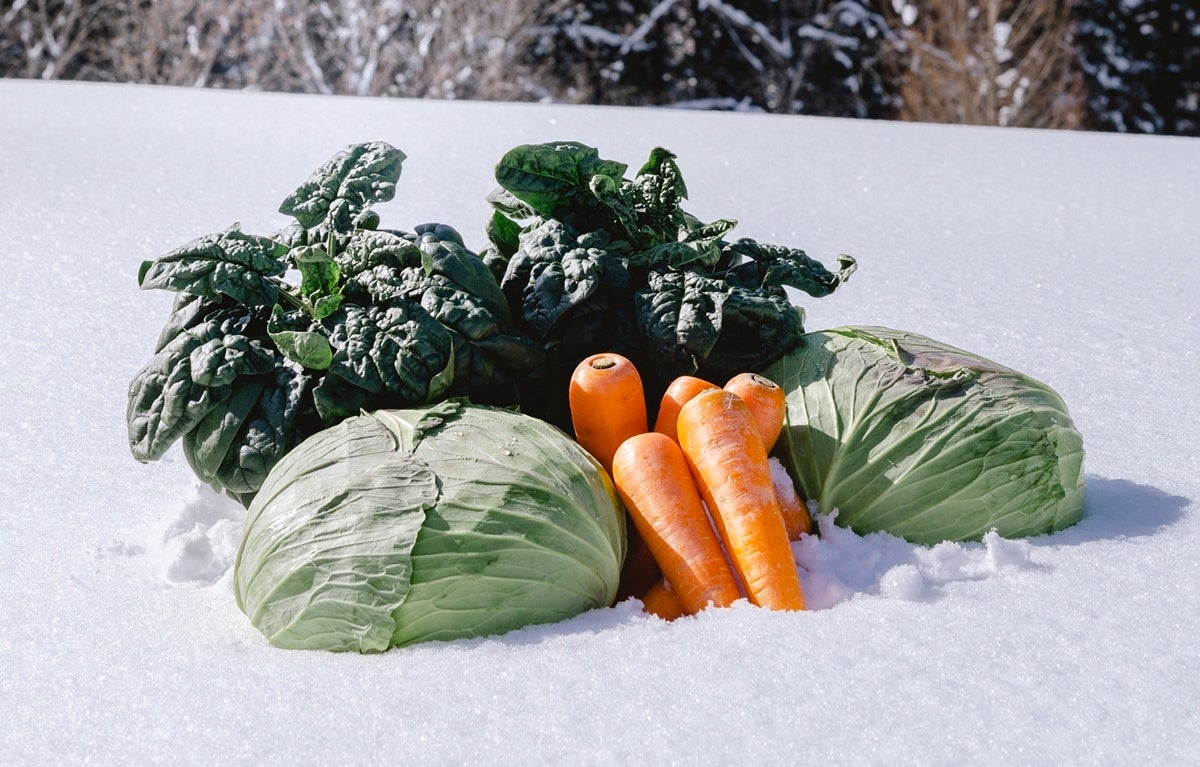 収穫した野菜を雪の中で保存したもの。雪の中と同じように温度・湿度が一定に保たれることで、甘みが増し、保存ができます。
