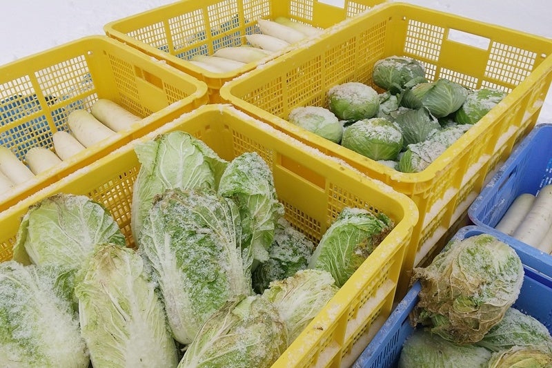深い雪のなかで甘さを蓄えたキャベツ。傷つけないように手作業で少しずつ掘り出します。えぐみや雑味が消え、フレッシュな味わいになるのが特徴です。