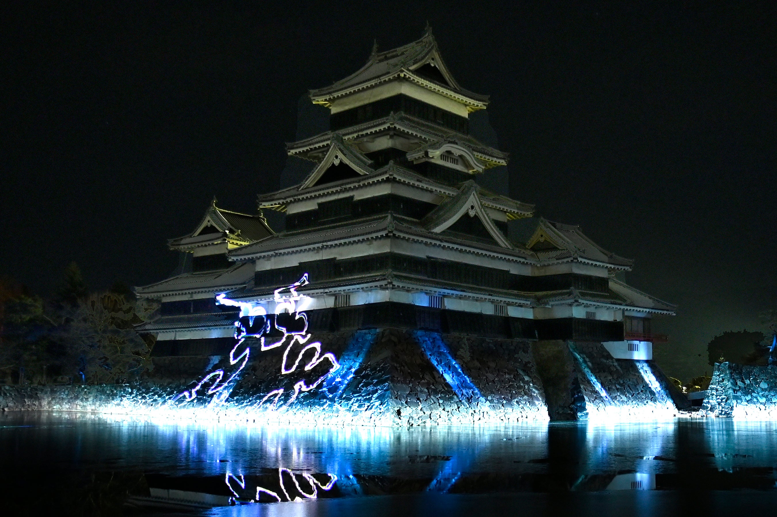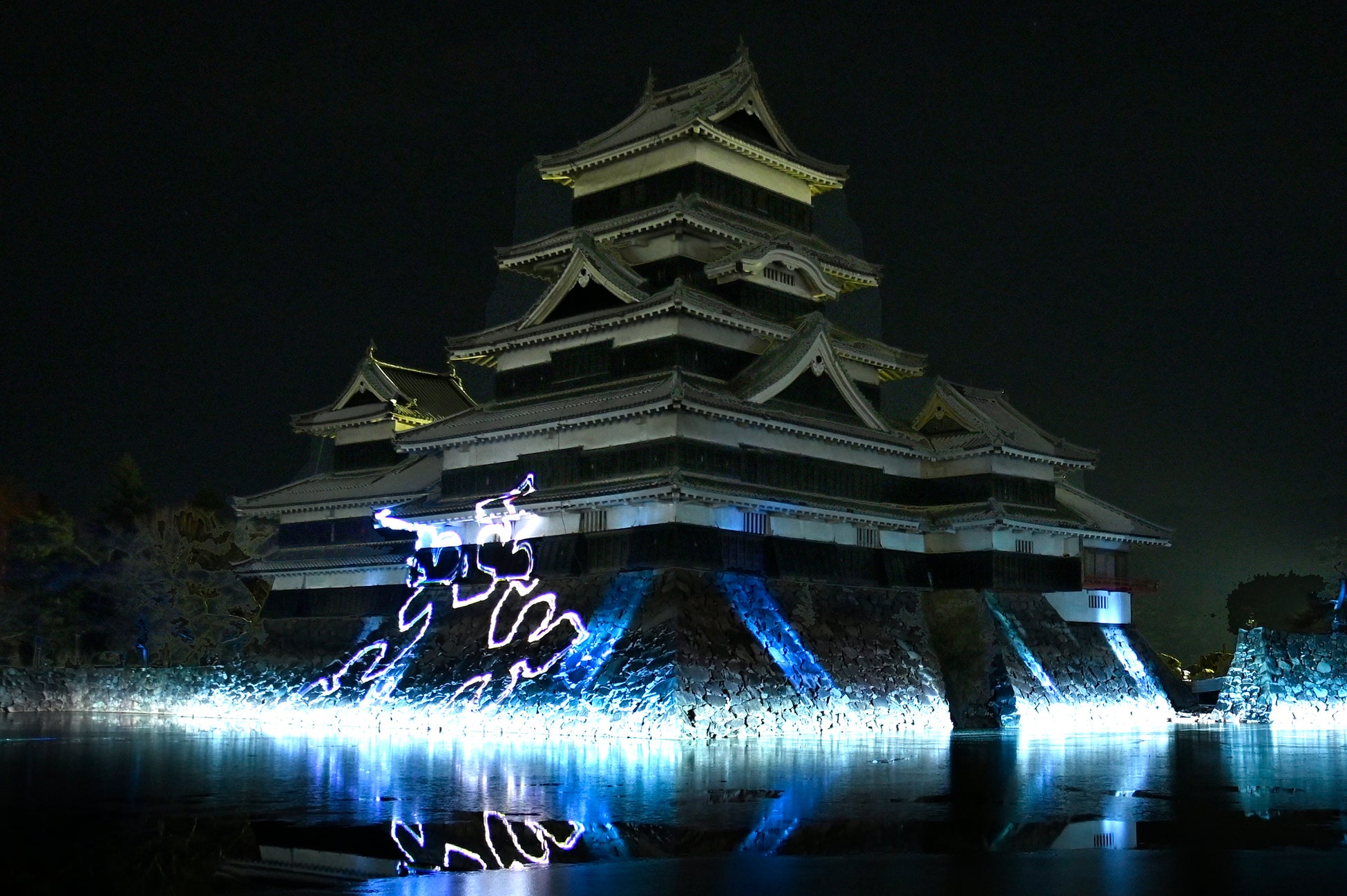 国宝松本城を対象として、日本トップクラスのクリエイターと共に、最新技術を用いた作品を公開しています。松本城天守の演出を中心に、石垣に対するレーザーマッピング、周辺植栽へのライトアップなど、レーザーと光、音楽が一体となったプログラミング制御による演出をお楽しみいただけます。