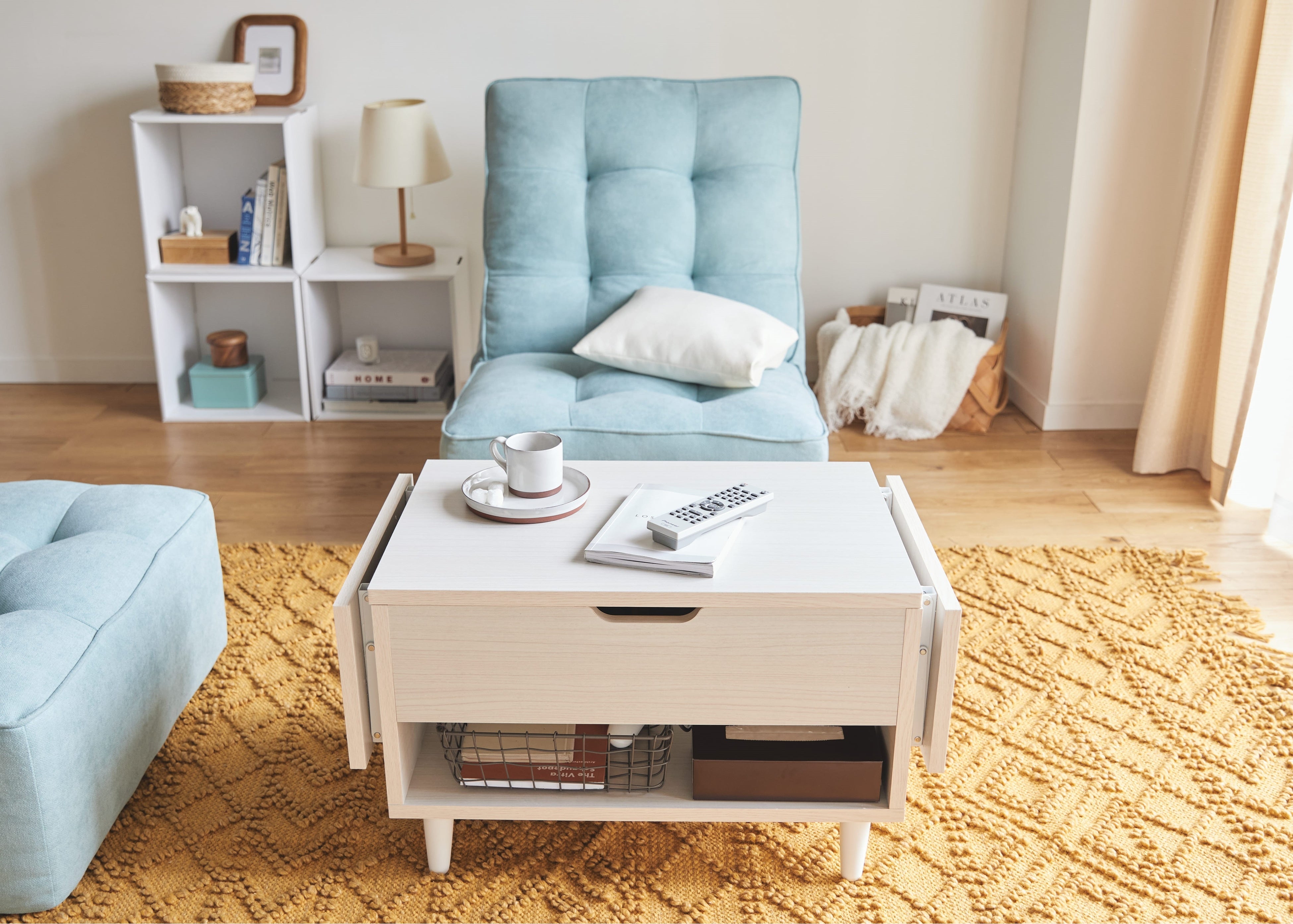 天板が昇降することでソファに座った状態でも作業がしやすく、天板下には収納スペースを確保。普段はコンパクトサイズで部屋を広く使うことができ、来客時には天板を広げることで複数人数の利用に対応する仕様に。まさにひとり暮らしにフィットするイイトコどりなテーブルが実現しました。2023年2月末発売予定。