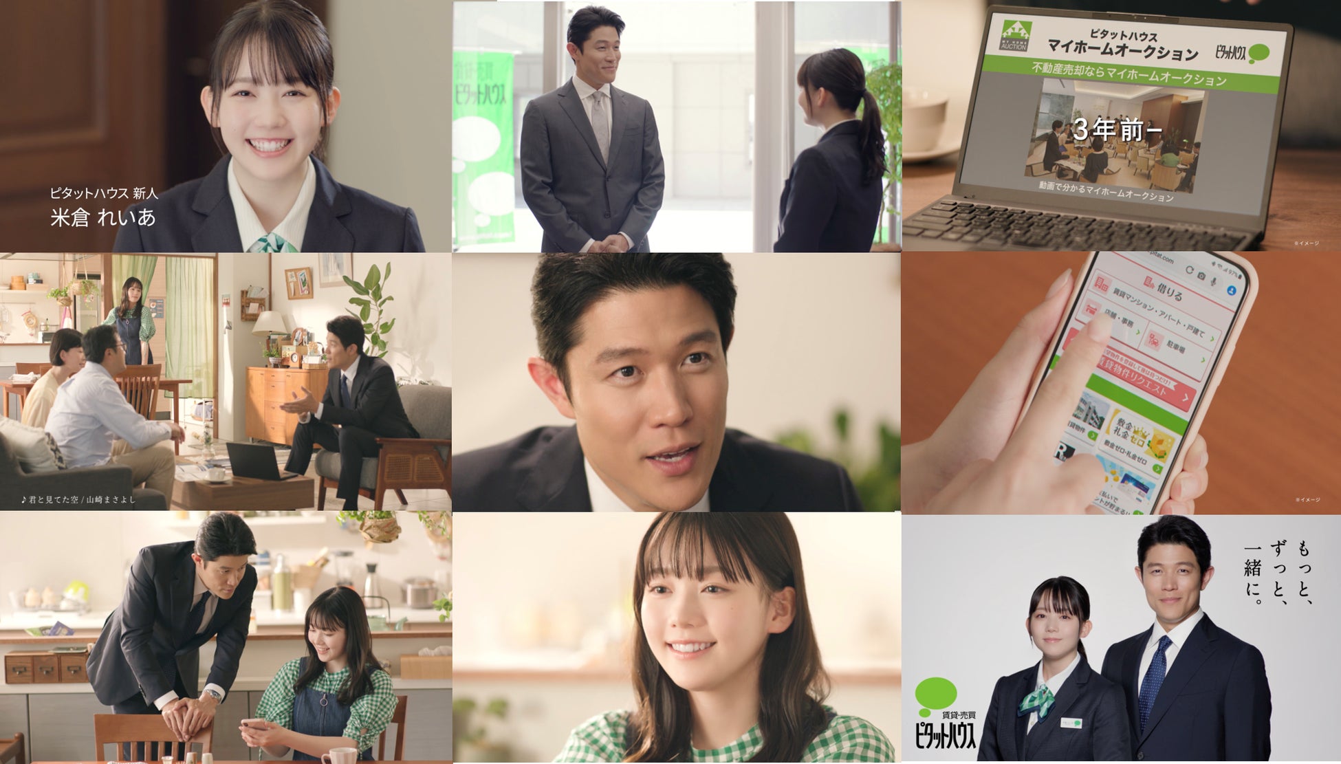 CM冒頭の米倉さんが憧れの鈴木店長を目の前に、緊張した面持ちで「新人の米倉れいあです。」と挨拶をする場面では、米倉さんのフレッシュさと、先輩として優しくも頼りがいのある鈴木さんの包容力が感じられる注目のシーンとなっています。さらに、家の売却から賃貸の相談まで「ピタットハウスにお任せください!」とお客様に自信をもって伝える鈴木店長の真摯なまなざしは、信頼を感じることができる見どころのひとつです。鈴木さんと初々しい米倉さんの掛け合いにご注目ください。