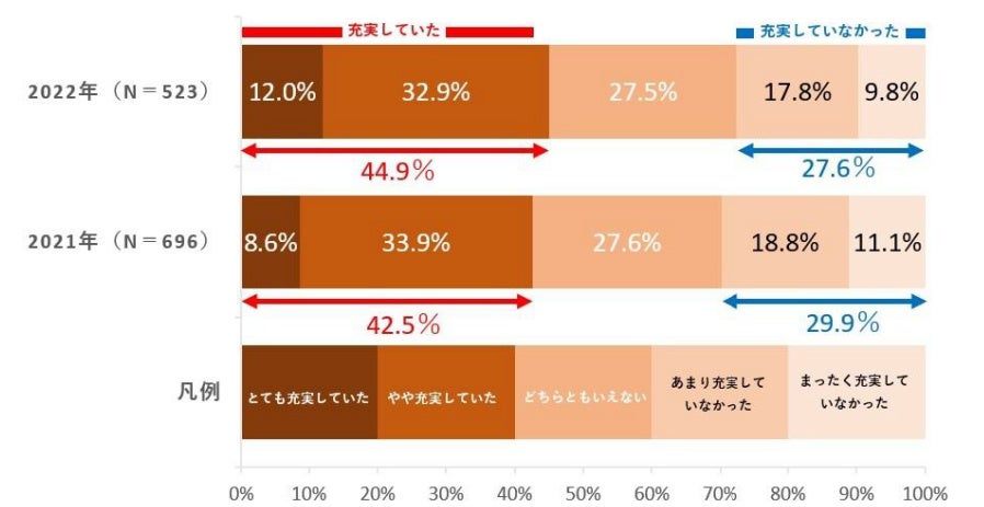 今年は昨年実施した調査(2021年12月16日~23日)に比べて、「生活が充実していた(とても充実していた+やや充実していた)」が2.4ポイント上昇し、44.9%と約半数の人が充実していたと回答しました。また、「生活が充実していなかった(あまり充実していなかった+まったく充実していなかった)」も昨年から2.3ポイント減少しており、昨年に比べて生活が充実した人が多かったことがわかりました。