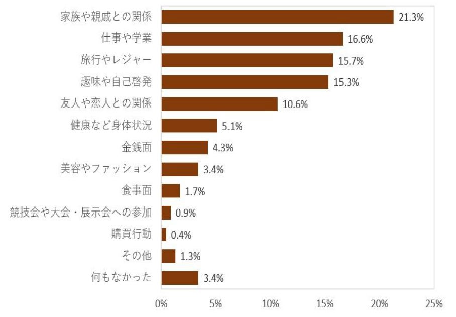 「生活が充実していた(とても充実していた+やや充実していた)」と回答した人の今年1年間で最も充実していたことでは、「家族や親戚との関係」がトップで21.3%でした。次いで「仕事や学業」(16.6%)、「旅行やレジャー」(15.7%)となり、「趣味や自己啓発」(15.3%)よりも高い比率を示しました。「仕事や学業」、「旅行やレジャー」の充実は、1年間の充実度をより高める傾向にあると推察されます。
