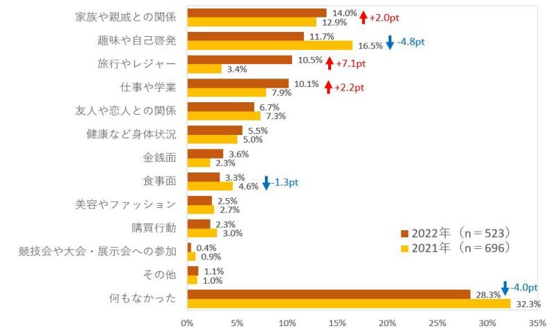 - 昨年調査から「旅行やレジャー」が上昇し「趣味や自己啓発」は減少