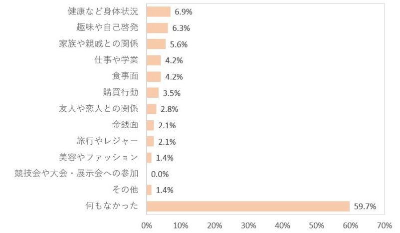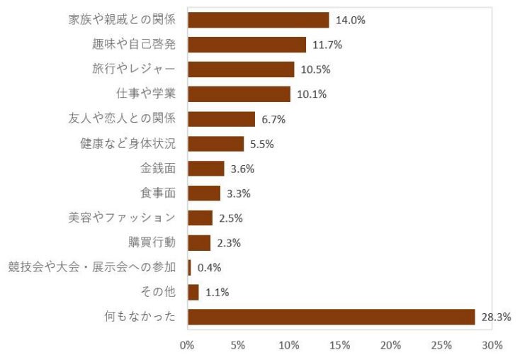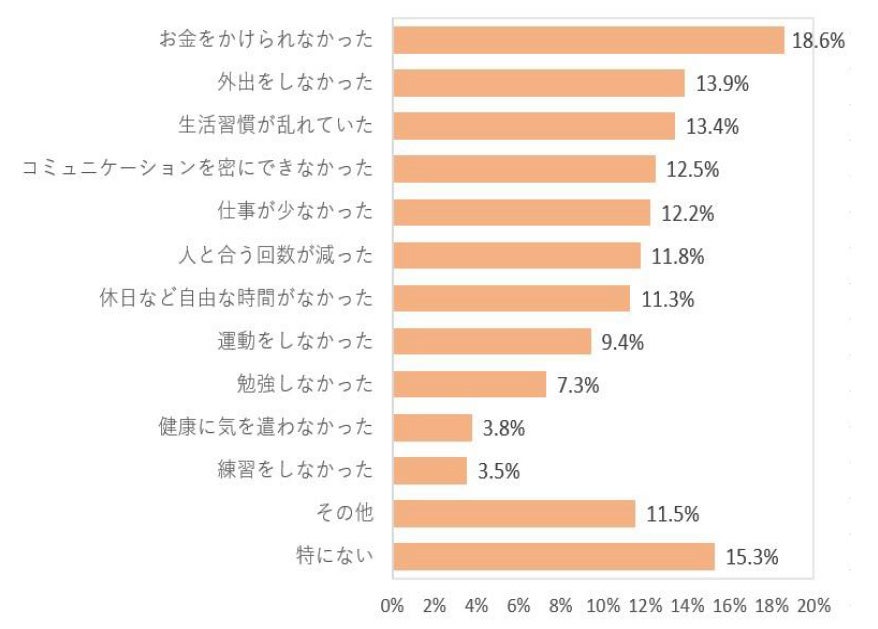 「今年1年間で最も充実していなかったことは何ですか?」で回答したことが充実しなかった理由では、「お金をかけられなかった」が18.6%でトップでした。生活を充実させるためには経済的な余裕が必要であることが浮き彫りとなりました。次に「外出をしなかった」(13.9%)、「生活習慣が乱れていた」(13.4%)が続きました。新型コロナ拡大から2年以上が経過し、外出を控えるなどの生活行動が常態化していることが伺える結果となりました。