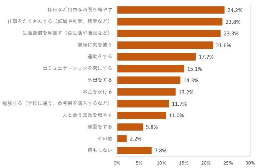 「来年最も充実させたいこと」のために何をするかでは、「休日など自由な時間を増やす」(24.2%)、「仕事をたくさんする(転職や副業、残業など)」(23.8%)、「生活習慣を見直す(食生活や睡眠など)」(23.3%)が上位を占めました。ゆとりある生活を望む人と仕事を頑張りたい人、規則正しい生活を目指したい人と、三者三様に意見が割れる結果となりました。