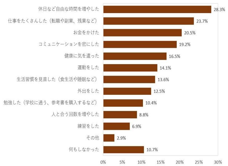 「今年1年間で最も充実していたことは何ですか?」で回答したことを充実させるためにしたことは、「休日など自由な時間を増やした」が28.3%、「仕事をたくさんした(転職や副業、残業など)」が23.7%、「お金をかけた」が20.5%に達しました。「家族や親戚との関係」や「趣味や自己啓発」「旅行やレジャー」を充実させたとの回答が多くみられたことから、これらのために「休日など自由な時間を増やした」や「お金をかけた」といった回答が高くなったものと推察されます。