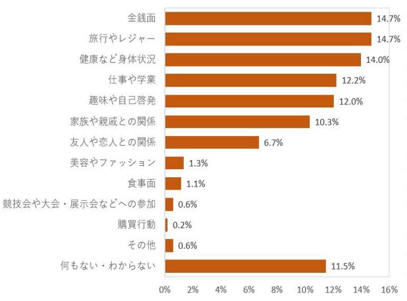 今年1年間で最も充実していなかったことは、「金銭面」が16.1%、「旅行やレジャー」が15.3%となりました。今年はエネルギーコストの上昇や急激な円安を背景にした原材料価格、包装資材の高騰に加え、物流コストの上昇などを理由に、様々な製品などが値上がりしたことで、金銭的な余裕を感じることができなかったと思われます。「旅行やレジャー」についても水際対策の規制緩和が行われたのが10月11日であったことを考えると、海外旅行を楽しめた人はごくわずかであると考えられることから、充実していなかったとする回答が多かったものとみられます。