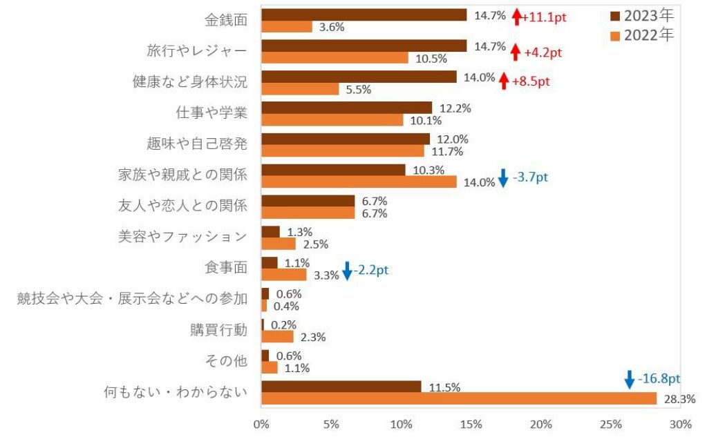- 2023年に最も充実させたいことは「金銭面」と「旅行やレジャー」 が並ぶ