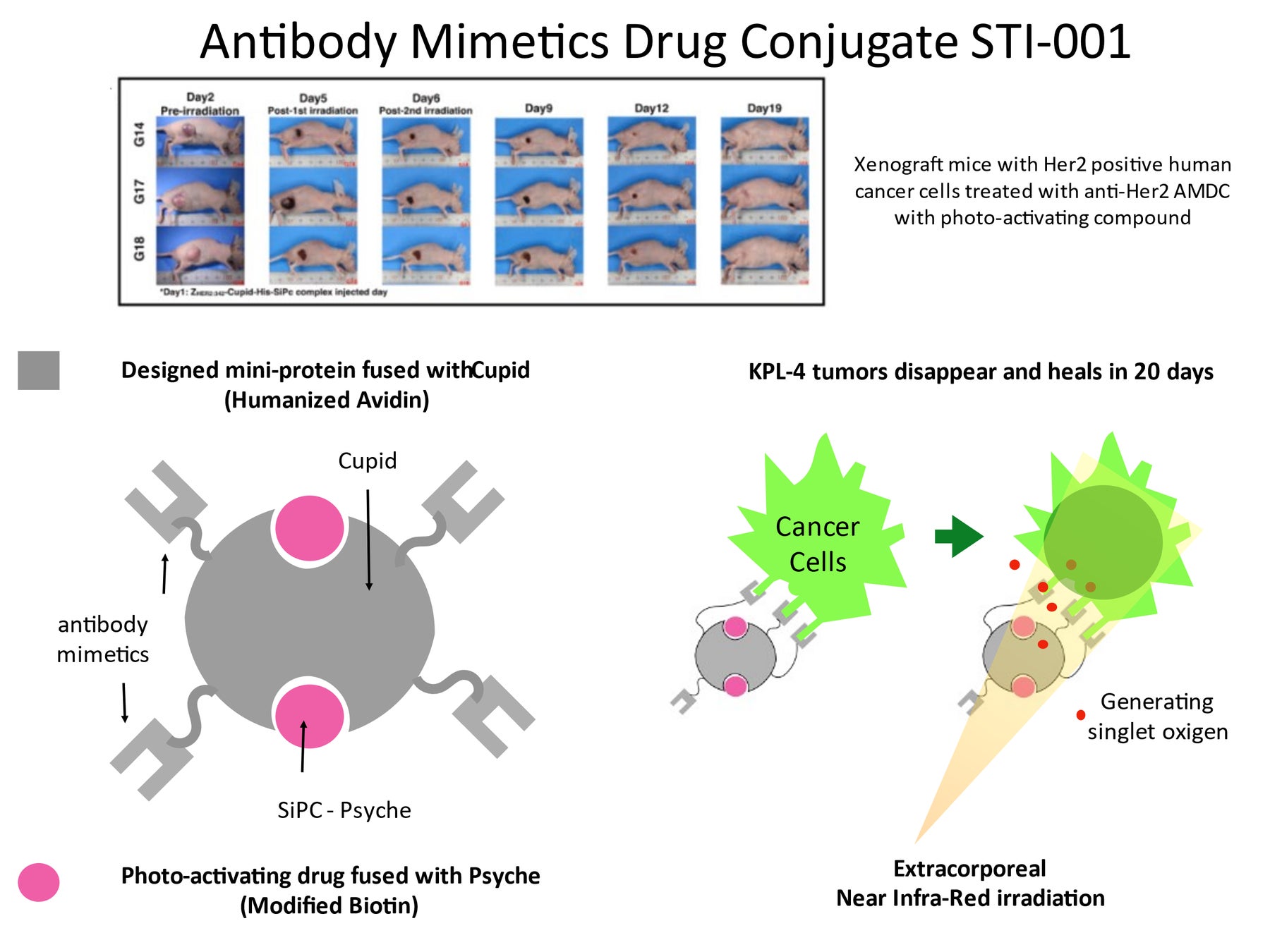 当社のCupid-Psyche AMDCプラットフォームは、光免疫療法、抗がん剤、放射性放出核種や免疫活性治療薬など、様々な治療薬の標的送達を可能にします。当社は、今回の論文に記載されているHER2-SiPc薬剤であるSTI-001を転移性乳がん、食道がん、胃がんや乳房外パジェット病の治療に向けて進めています。当社は、転移性乳がん、切除ができない頭頸部がん、非小細胞肺がん、膵臓がん、トリプルネガティブ乳がんなどを治療するために、独自に設計したタンパク質、ナノボディ(VHH)、アフィボディやその他の標的リガンドを開発する企業と提携を進めてまいります。