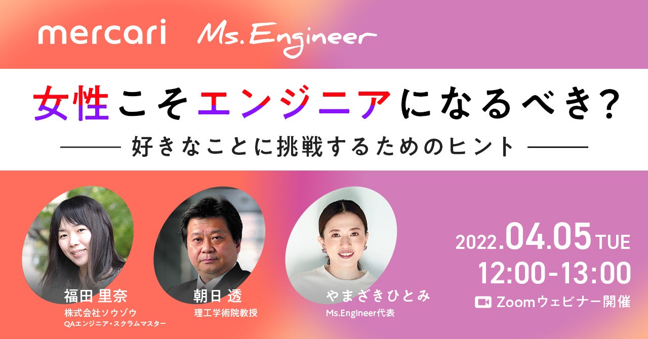 未経験から最短6ヶ月で世界に通用する女性エンジニアを育成する、オンラインプログラミングブートキャンプ「Ms.Engineer(ミズエンジニア)」を運営するMs.Engineer株式会社(本社:東京都千代田区 代表取締役やまざきひとみ)は、フリマアプリ「メルカリ」を運営する株式会社メルカリ(本社:東京都港区、代表取締役CEO:山田進太郎、以下メルカリ)と「女性エンジニアのエンパワーメント」を目的としたオンラインイベントを4月5日12:00より開催することをお知らせいたします。