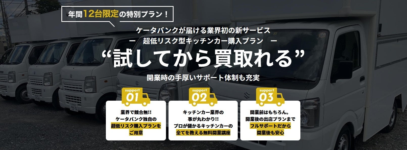 ケータバンク(株)が提供台数限定の超低リスク型キッチンカー購入プラン「”試してから買い取れる”」をリリース。本プランがキッチンカー参入の「安全」かつ「無駄無く」を実現します。