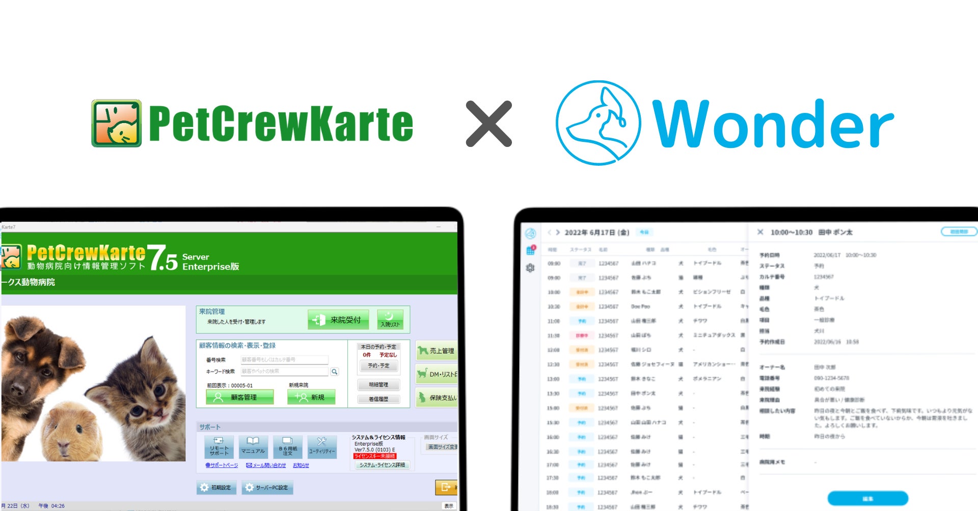 動物病院向け予約管理システム『Wonder』が、動物病院向け電子カルテ『ペットクルーカルテ』とシステム連携し協業を開始
