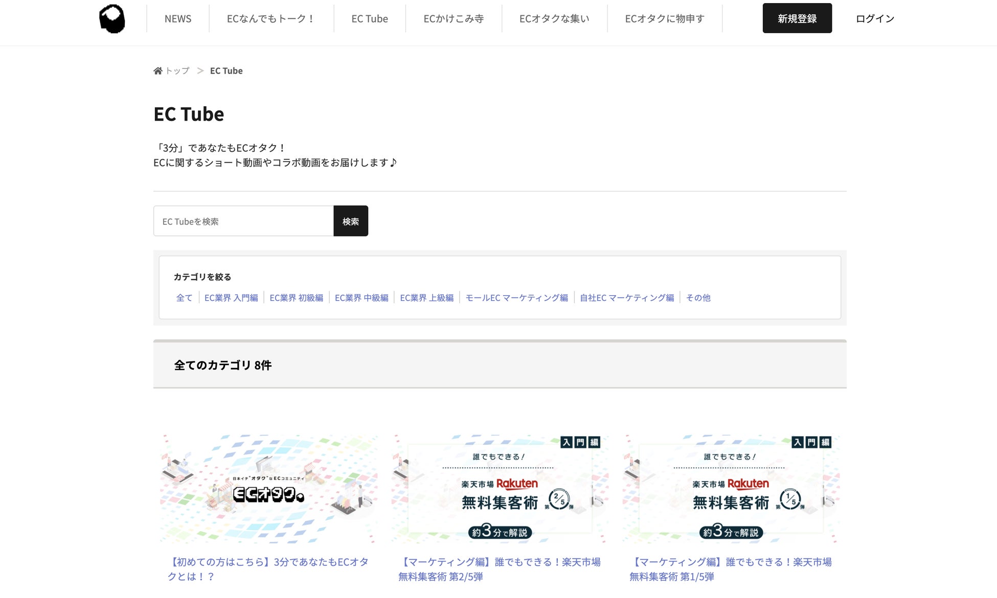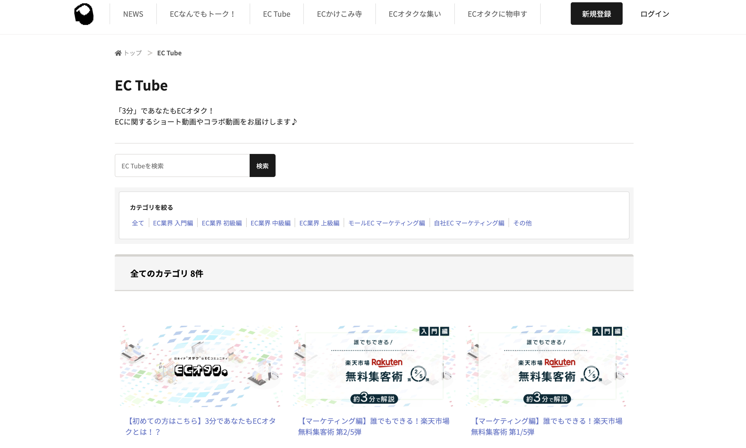 - EC業界の話を、入門編・初級編・中級編・上級編・就職編、マーケティングの話を、自社EC編・楽天市場編・Amazon編・Yahoo!編・事例編のカテゴリに分けてお送りする、1動画約3分で学べる動画コンテンツです。まずは、これからEC業界に飛び込む方やECを始めたい方に向けた、入門編・初級編の動画を配信していますが、長期的にはコラボ動画や、すぐに活用できる実践的な動画コンテンツを配信していきます。