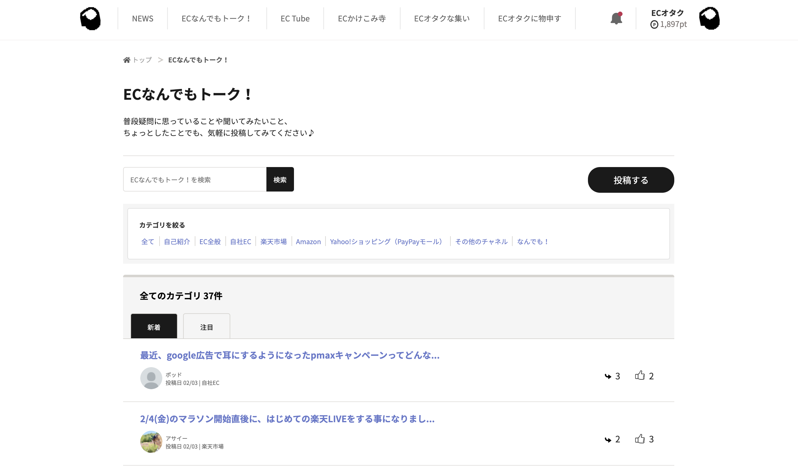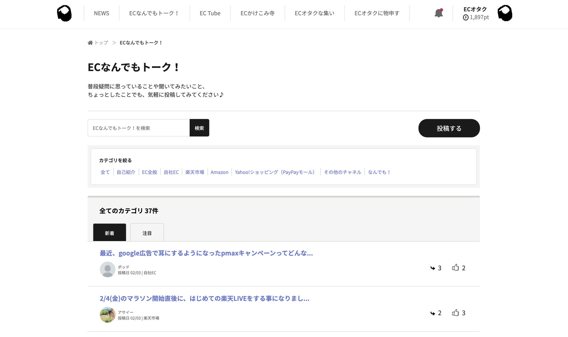 - 簡単にいうとEC特化型の掲示板機能です。ECに関わる皆さんが普段疑問に思っていることや、聞いてみたいことを投稿し他のユーザーが回答することで悩みが解消され、ちょっとしたコツや事例を紹介することで学びが共有されます。「ECに関わる様々な人が仲間になりお互いに助け合う」そんな場所を実現するためのメインの機能です。