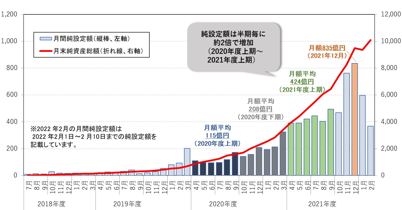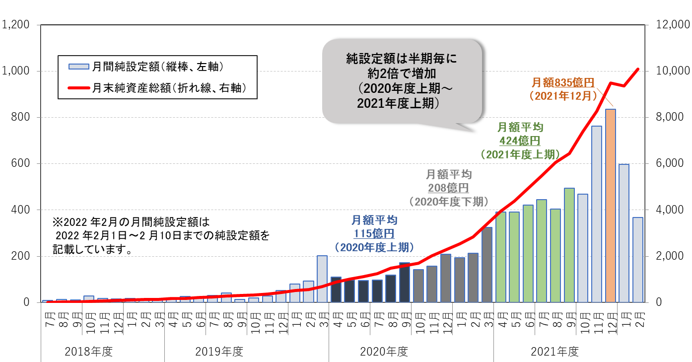 2018年7月3日に設定した同ファンドは、多くの投資家の皆さまにご愛顧いただき、設定来順調に残高を増やしてまいりました。月間の純設定額は年々大きく伸びており、2020年度上期は月額平均で115億円、下期は同208億円、2021年度上期は同424億円となり、2020年度下期の約2倍に増加しました。なお、2021年12月は835億円と2021年度上期月額平均の約2倍となり、同ファンドにおける月間純設定額の過去最高を記録しました。