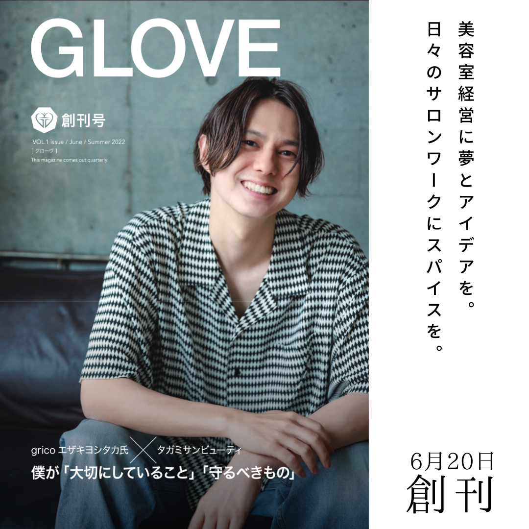 株式会社タガミサンビューティ( 代表 : 坂東信行 本社 : 東京都渋谷区代々木)は、美容室経営者と美容師に向けた季刊誌「GLOVE」を創刊いたします。2022年6月20日より、タガミサンビューティとお取引いただいている美容室さまに無料配布を開始。創刊号は、美容室「grico」を率いるエザキヨシタカ氏を表紙と巻頭特集に起用。2号に渡って当社執行役員との対談記事を掲載いたします。