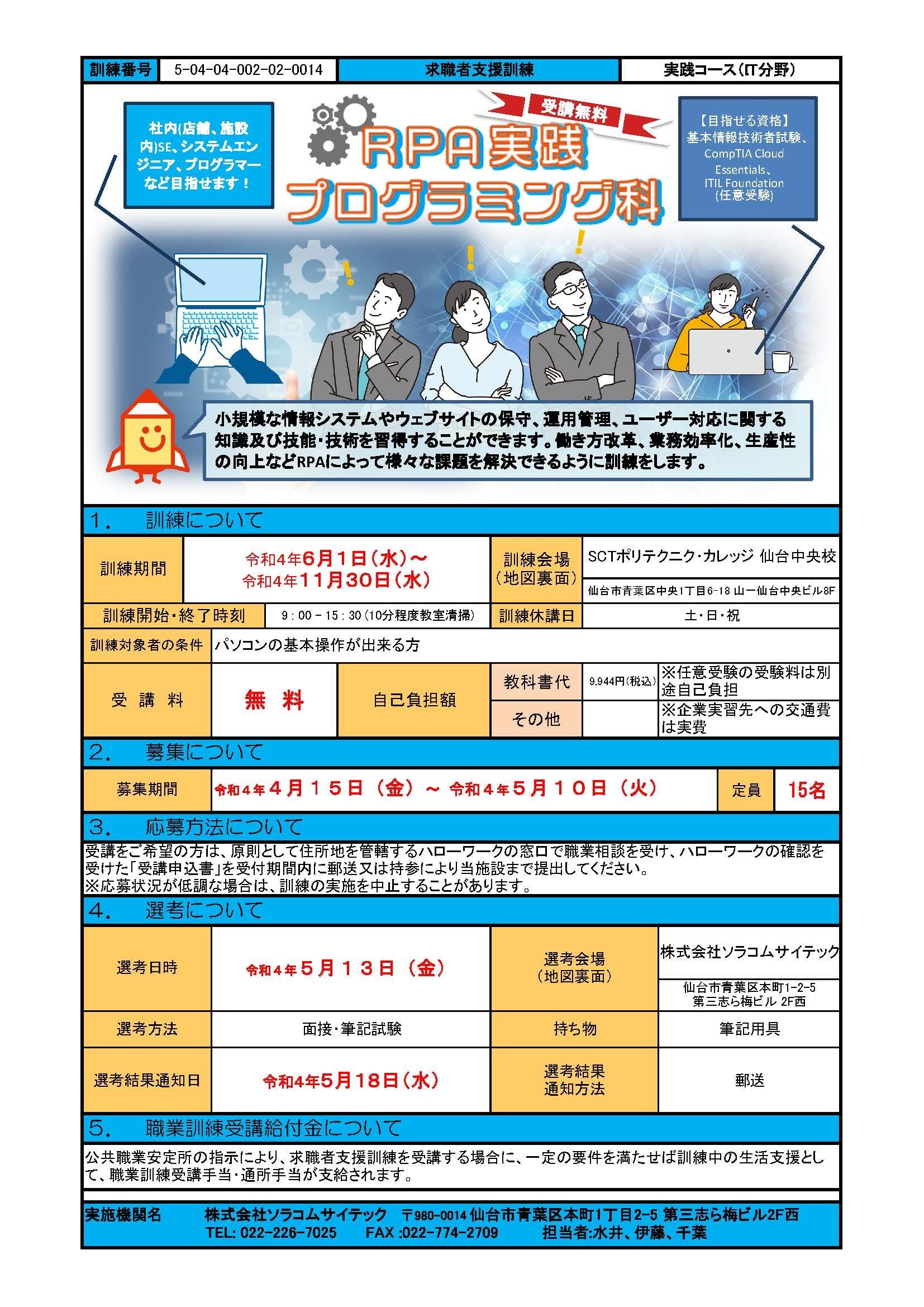 仙台市でIT人材教育サービス・サイバーセキュリティソリューションを提供する株式会社ソラコムサイテック(本社:宮城県仙台市、代表取締役:高橋洋人、以下「ソラコムサイテック」)が展開する求職者支援訓練5月開講コース「社内SE・WEB実務担当者養成科」の募集期間の締切間近となりました。
