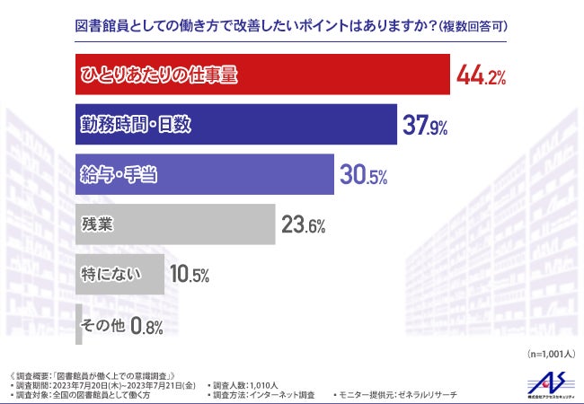 「図書館員としての働き方で改善したいポイントはありますか?(複数回答可)」と質問したところ、『ひとりあたりの仕事量(44.2%)』と回答した方が最も多く、次いで『勤務時間・日数(37.9%)』『給与・手当(30.5%)』『残業(23.6%)』『特にない(10.5%)』と続きました。