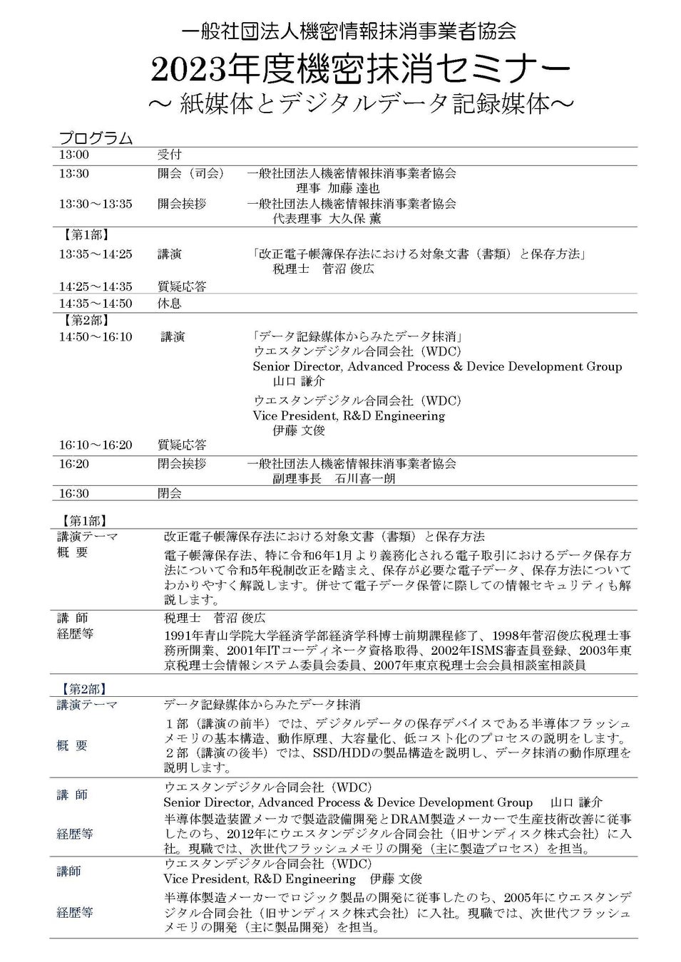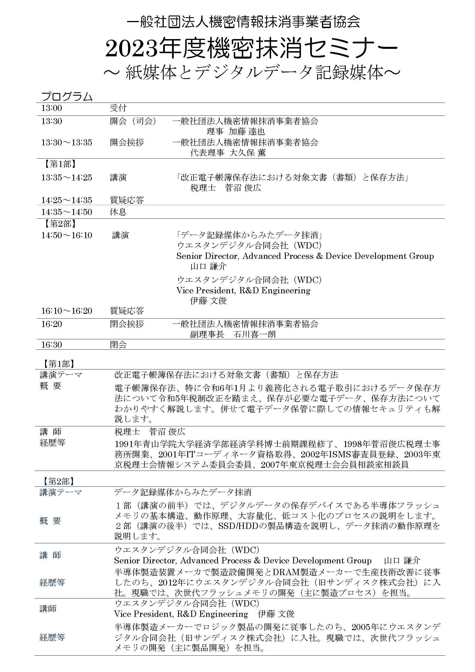 こうした動向を踏まえて、「紙媒体とデジタルデータ記録媒体」をサブテーマに11月30日に3名の講師を招聘し機密抹消セミナーを開催します。参加費は無料です。