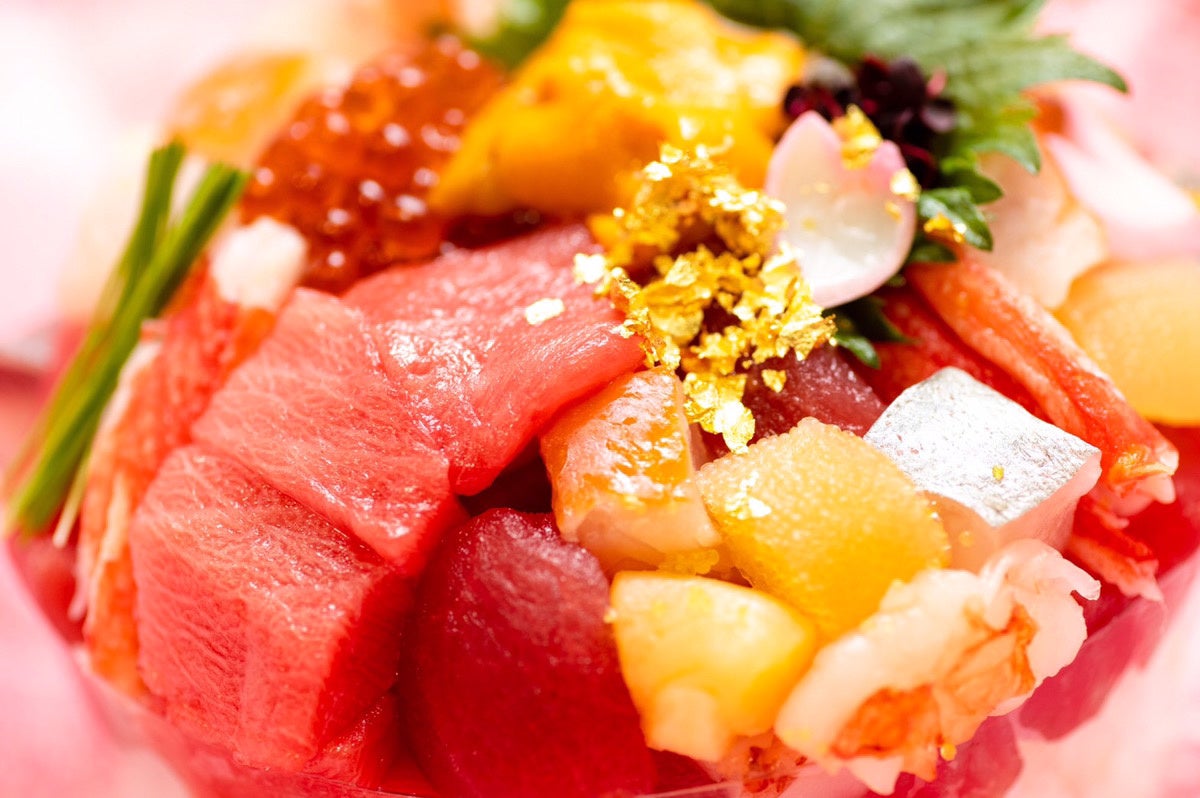 その他、北海道産うに、いくら、カニ、金目鯛、かんぱち、ひらめ、数の子、柚子貝柱、赤海老、花びら百合根を、オリジナルの粕酢を使った酢飯にちらしました。